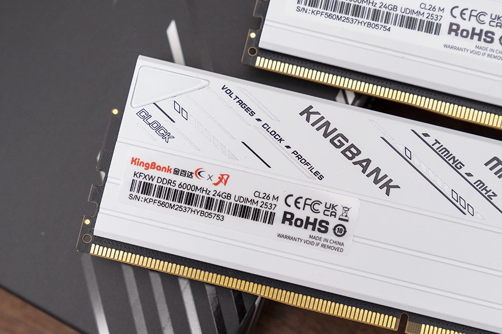 从背面的标签可以看到,金百达星刃MPOWER联名版为单条容量为24G,采用海力士M-Die颗粒,配合10层PCB电路板和不锁电压的PMIC,使得内存条能够以CL-26-36-36-86的超低时序运行。具备极低的延迟与极高的稳定性,在复杂的数据读写操作中,能快速响应指令,为内存的高性能运行提供了坚实基础。