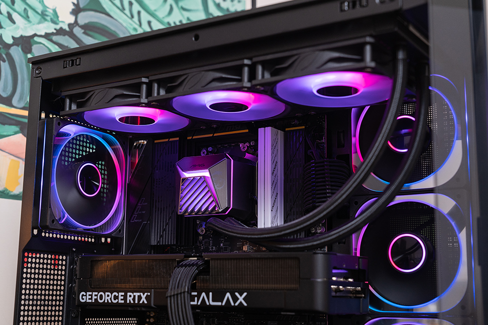 散热方面搭配微星 MAG CORELIQUID A15 360 水冷,冷头外观线条锐利棱角分明,多边形的框搭配闪电+栅格镂空,磨砂+金属拉丝多重工艺,通电后中心位置和边框都带有ARGB灯光效果,内部配备陶瓷泵芯,转速高达3400转/分钟,与高品质陶瓷轴承相结合,在实现强劲性能的同时,也达成了静音运行之间的良好平衡。