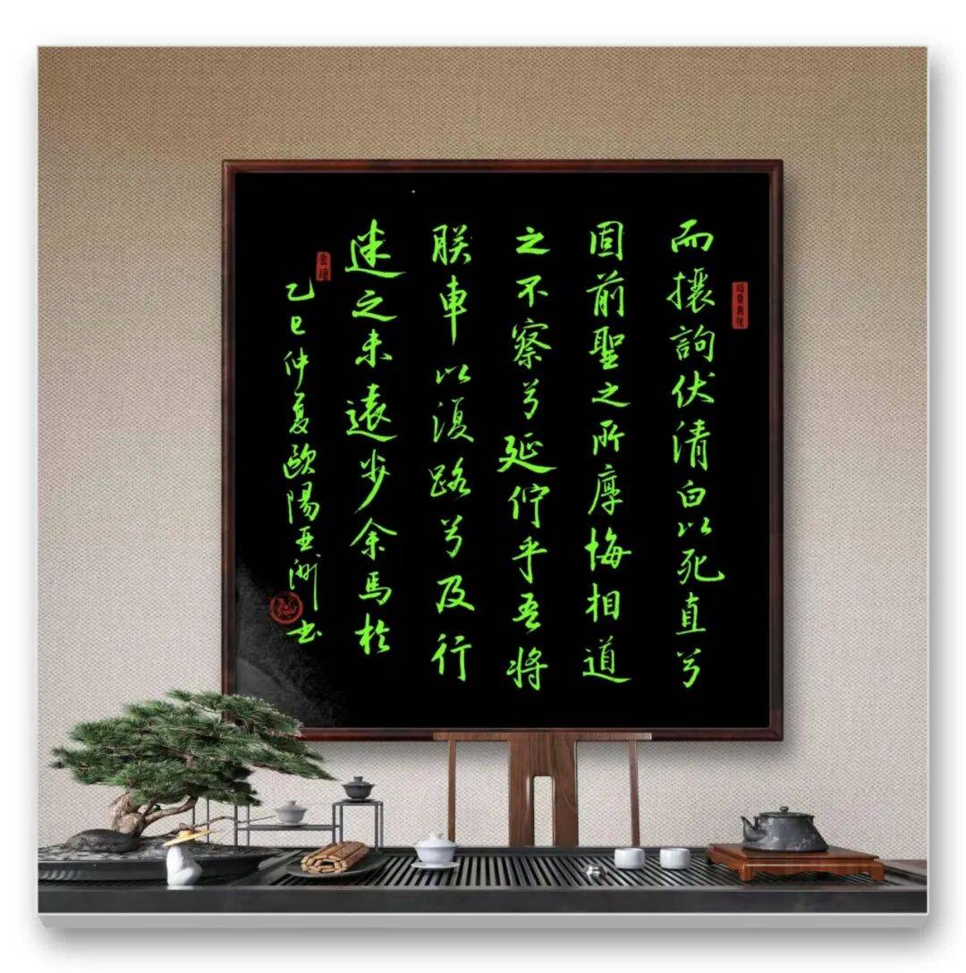 欧阳亚洲先生的书法笔法的精研,对古典文本的深耕,证明传统书法的“法”与“道”是不可抛弃的核心。在当代书坛“创新至上”的浮躁风气中,这种坚守是对书法本质的清醒认知——书法的创新必须建立在对传统的深刻理解之上,否则只会沦为无源之水、无本之木。他在色彩、载体、形式上的创新,回应了当代观众的视觉与空间需求,让书法从“文人案头”走向“大众视野”。这种尝试证明,传统艺术并非曲高和寡,只要找到与当代生活的连接点,便能获得广泛共鸣。
