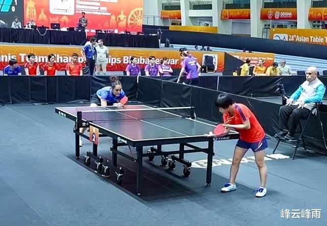 参加2025亚洲乒乓球锦标赛的朝鲜女子王牌选手金琴英(右)的比赛场面
