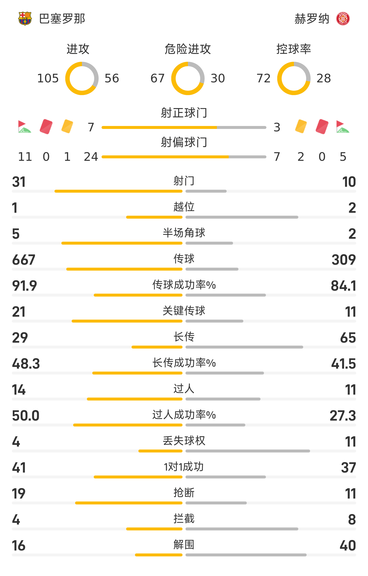 技术统计显示,巴萨以72%的控球率和667次传球全面压制赫罗纳,射门数更是达到31比10,但弗里克在第90+2分钟因与主裁激烈争执被逐出场,场边的混乱一度打断比赛节奏。
