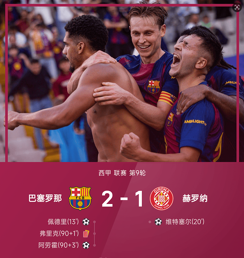 在本轮西甲焦点战中,巴塞罗那坐镇主场以2-1险胜赫罗纳。佩德里早早为巴萨首开纪录,维特塞尔一记倒钩扳平比分,比赛尾声阶段,阿劳霍在补时阶段完成绝杀,而主帅弗里克因对裁判判罚不满被红牌驱逐出场。
