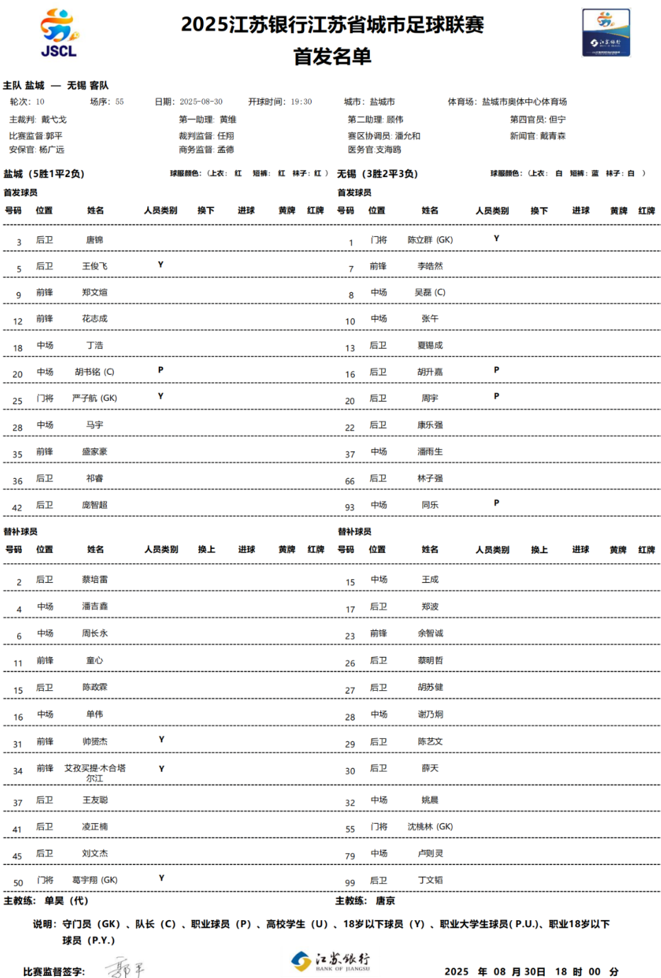 再来对比一下盐城两次面对无锡的阵容。第一次是由助理教练单昊代为指挥,主教练慕志磊临时下课。而第2次慕志磊回归。从球员首发阵容来看,胡书铭、祁睿、丁浩、花志城、马宇、郑文煊、王俊飞这7个人两次都是首发。庞智超也就是在第一次对阵无锡的时候受伤的,此后再未登场。唐锦2黄停赛。替换他俩的应该是周长永和朱晓航。此外,盛家豪从首发到替补,替补的前锋是许旸。