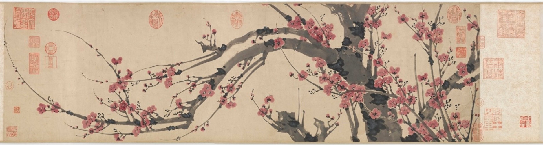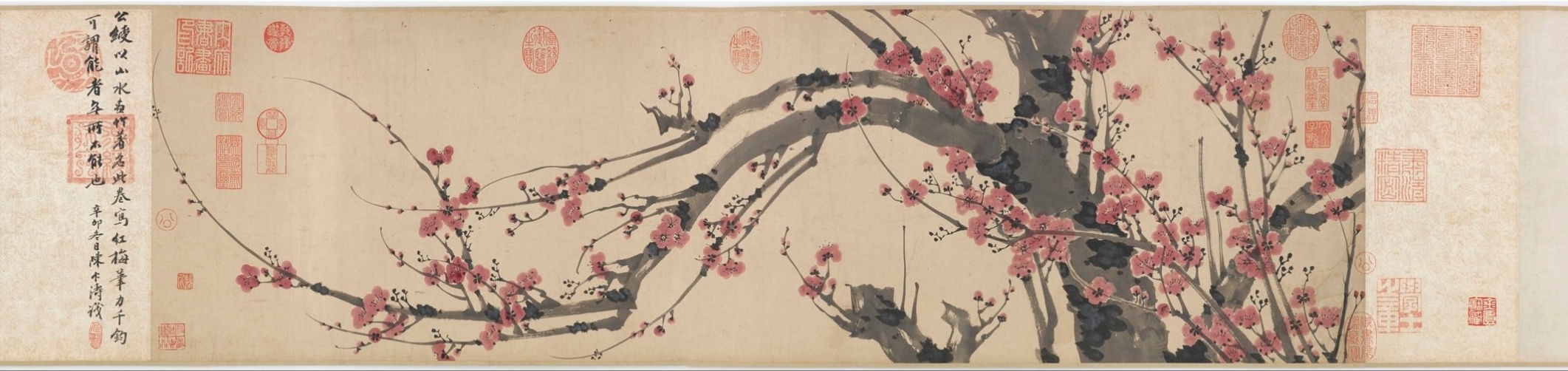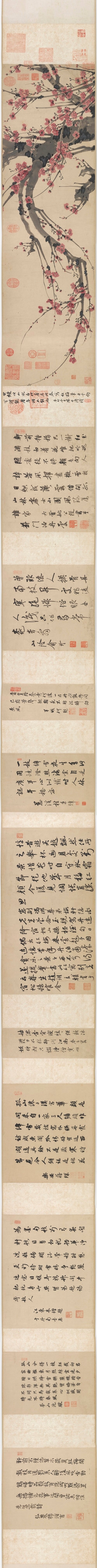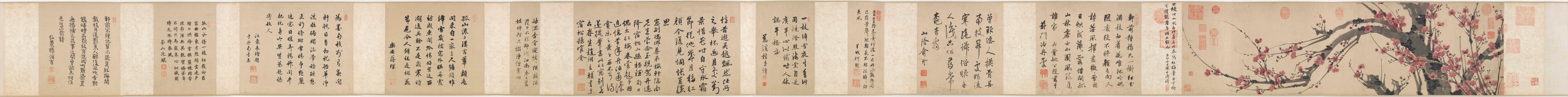 - 名称:《红梅图卷》 - 材质:纸本设色长卷 - 尺寸:31.9 × 112.8 厘米