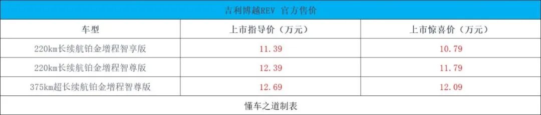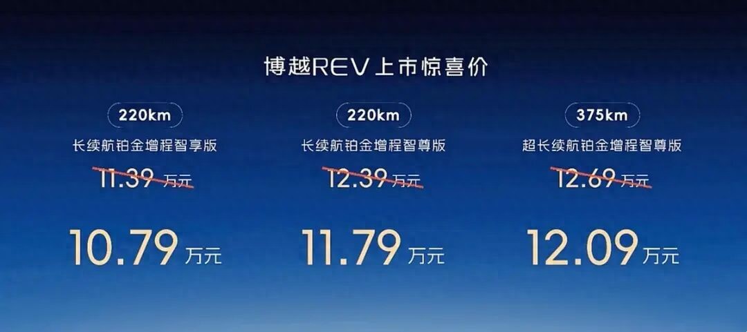 吉利博越REV上市,增程SUV,售价为10.79万起,新车纯电续航分别为220km和375km,综合续航分别为1400km和1525km,配置也很丰富,要买吉利博越REV直接上顶配。想要了解更多新车资讯,购车行情,欢迎留言互动。大家购车一定要理性消费。(图/文:懂车之道 李玲 编辑)