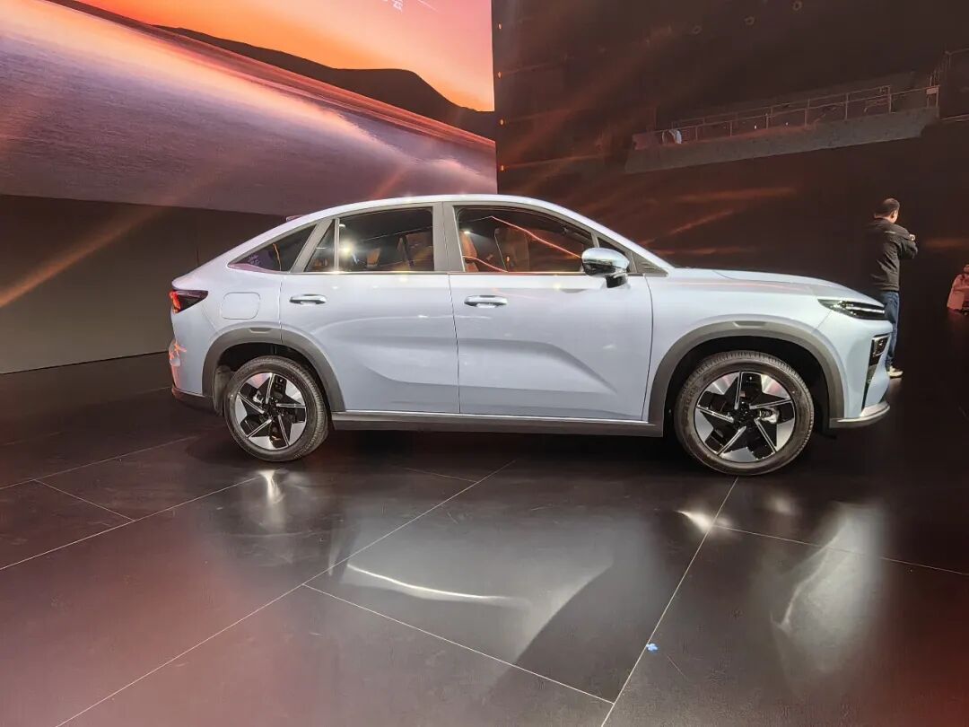 来到车身侧面,车顶部配备行李架,悬浮式车窗,传统式门把手,俯冲的腰线,配备多幅式轮圈。