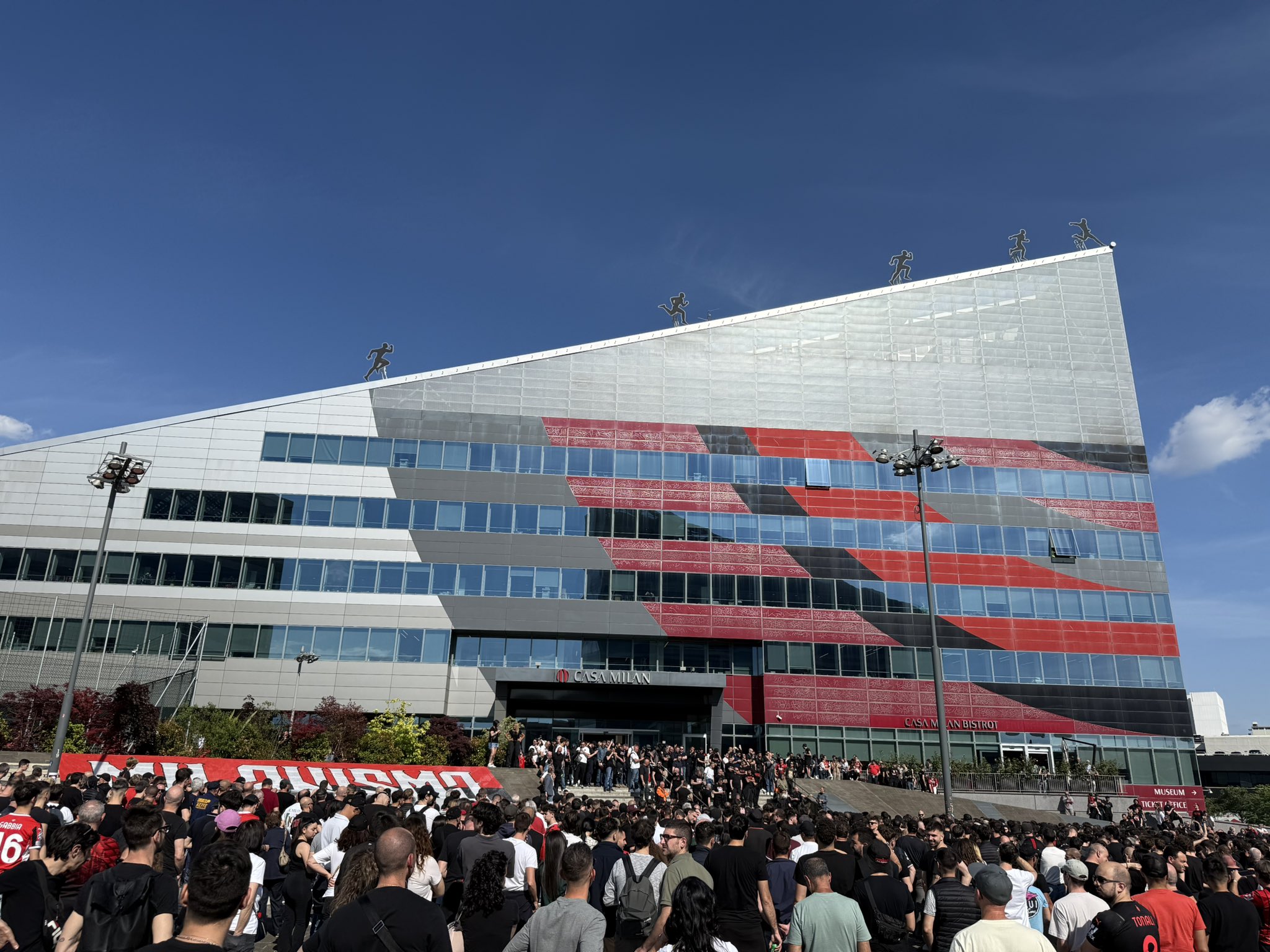 米兰总部前聚集了3000名前来抗议的球迷。上一次米兰集聚此处是在21-22赛季庆祝球队意甲夺冠。