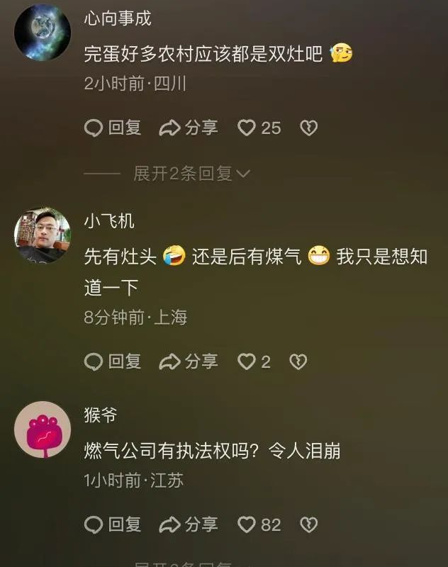 这家燃气公司的工作人员后来回应了,说是这户人家在同一个房间里,既有燃气灶,又有柴火灶,他们觉得这样“存在安全隐患”,所以才贴了封条,要求整改,并且停了燃气,还声称他们的做法“符合行业规范”。