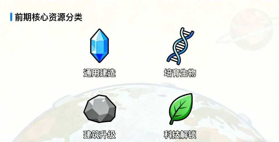 游戏前期无需追求所有资源,重点聚焦4 类高价值资源,它们是解锁建筑、升级科技、培育生物的关键,具体如下: