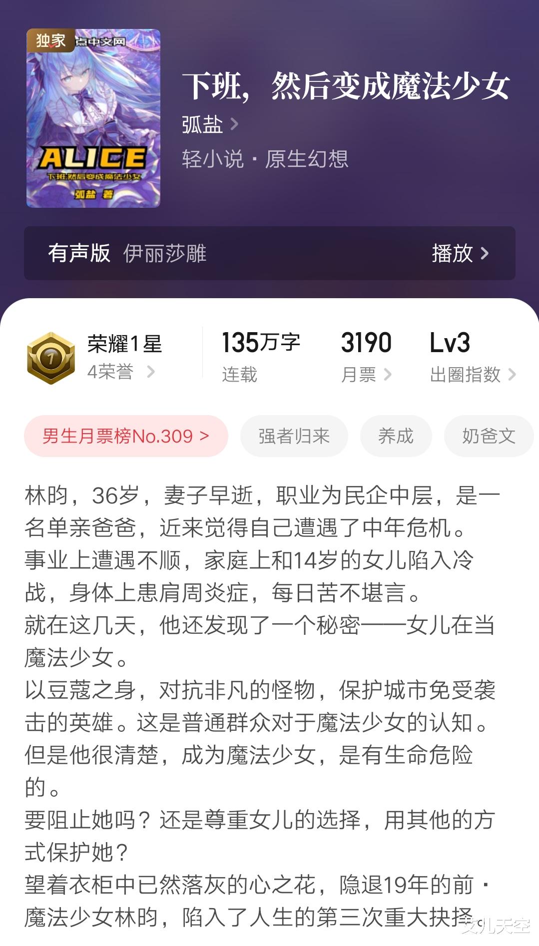 起点上的魔法少女题材的兴盛主要还是在弧盐写了那本《下班,然后变成魔法少女》开始。