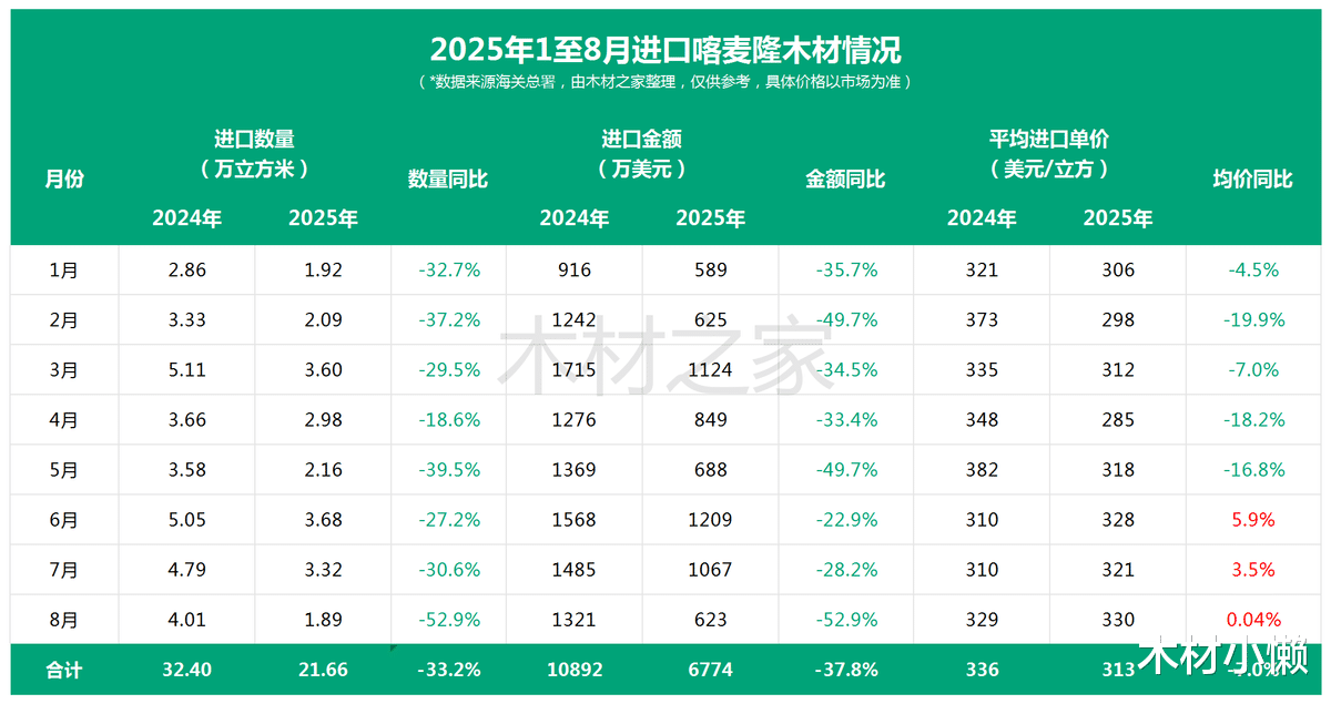 这一政策调整带来的效应一定程度上传导至喀麦隆—中国木材的供应链。2024年喀麦隆对华木材出口总量同比下滑19%,2025年跌势延续:海关月度数据录得1—8月对华出口量为21.66万立方米,同比再降33.2%,连续第八个月负增长。值得注意的是,喀麦隆对华木材出口结构仍以原木为主,占比78%(16.95万立方米),而锯材占比不足四分之一。