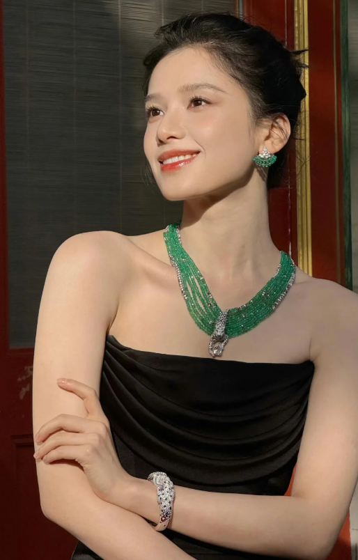 一袭黑色荡领抹胸礼裙搭配祖母绿钻石珠宝,高颅顶盘发配合精致的秋日氛围感妆容,恰到好处的展现出了她身上成年女性的淡雅脱俗。
