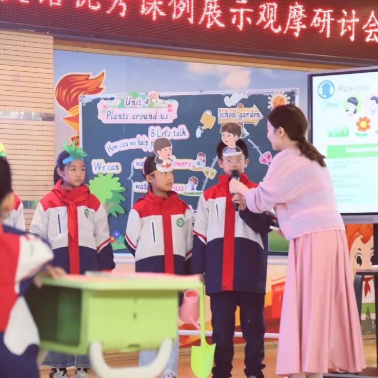 首先由信阳市羊山外国语小学高倩茹老师带来的PEP 2024版三年级上册第四单元“Plants around us” B Let’s talk观摩课精彩展示。高老师以新课程理念为指导,以单元话题为背景,首先用歌曲活动导入新课,引出主题“garden”,接着利用绿色校园行动引出“school garden”,用孩子们熟悉的场景感知新知,在设计教学活动时,充分发挥了孩子的主体作用,训练方式多样,形式丰富多彩。在“联系生活实际创编对话”中由课文中的help school garden延申到help Baihua Garden,课程的最后又进一步升华,从如何帮助校园到如何帮助我们周围的环境,再到如何帮助我们的祖国,环环相扣,层层递进。最后以“Lucid waters and lush mountains are invaluable assets绿水青山就是金山银山”做总结,主题得到升华。