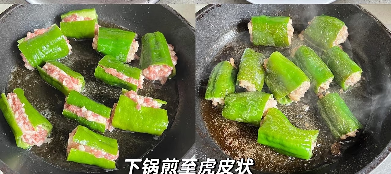 - **煎制青椒**:锅中倒入适量食用油,油热后,将酿好肉的青椒放入锅中,有肉的一面朝下,小火慢煎至肉馅表面金黄,然后翻面,继续煎至青椒表面微微焦黄,散发出香味。