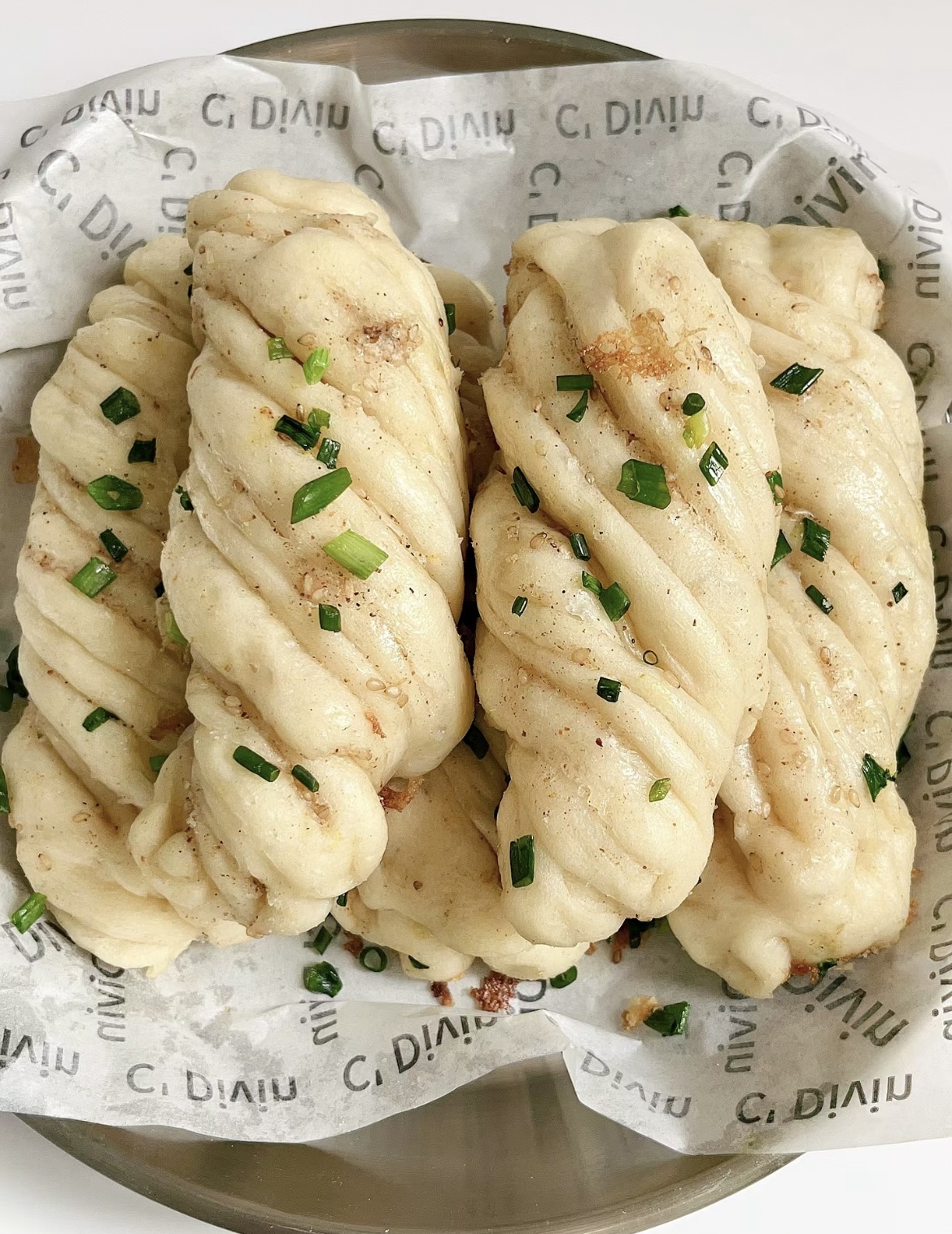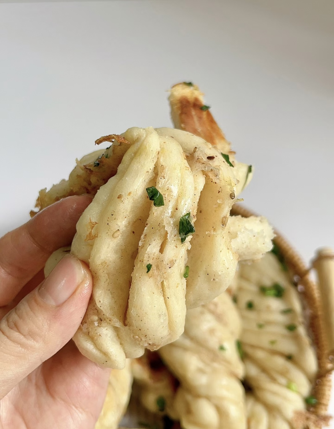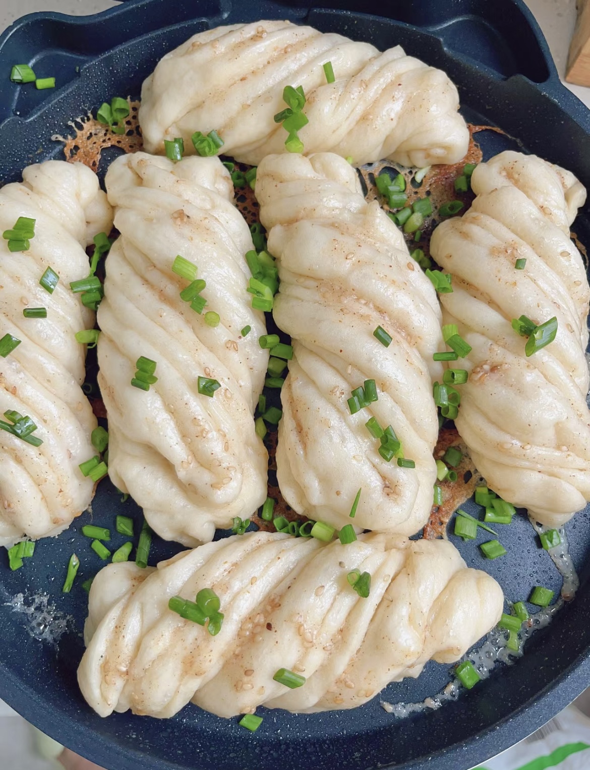 9️⃣ 出锅前撒上一些葱花作为点缀,香煎椒盐花卷就做好了!