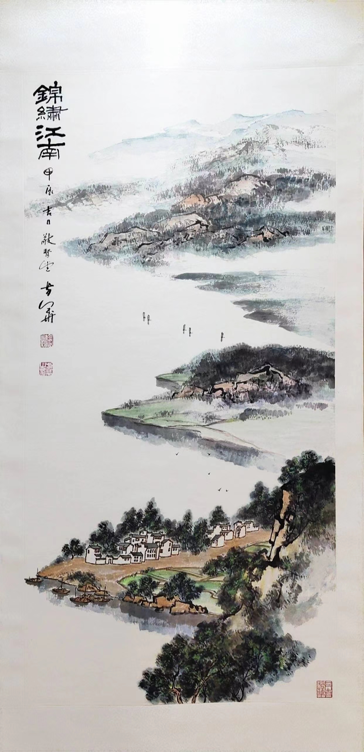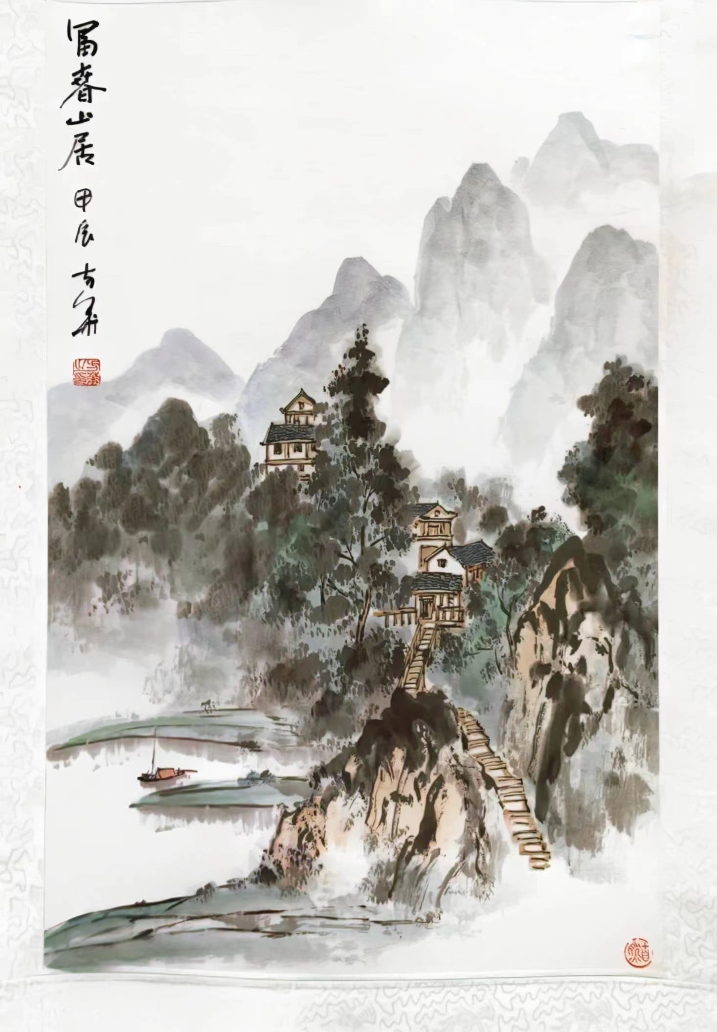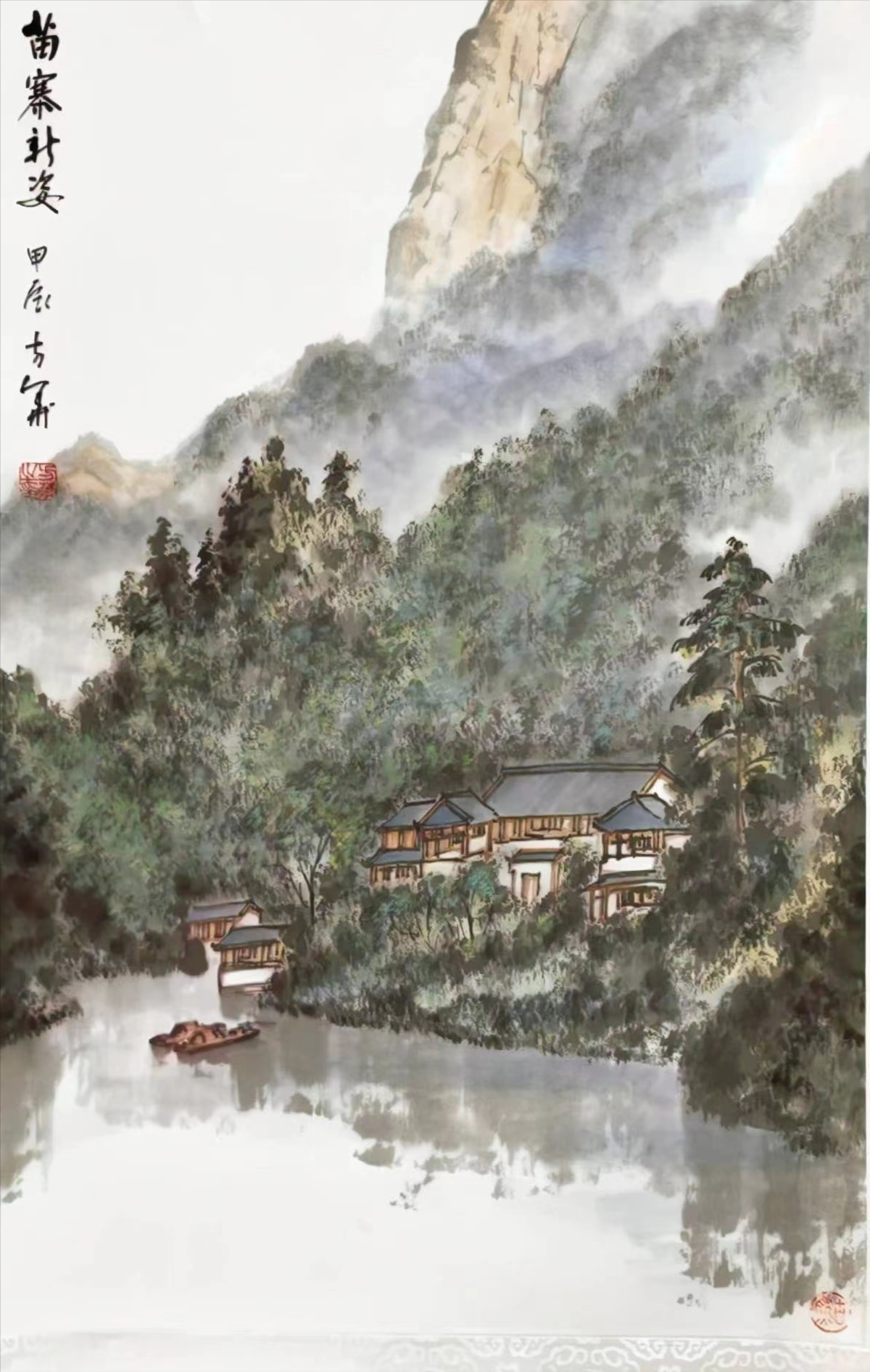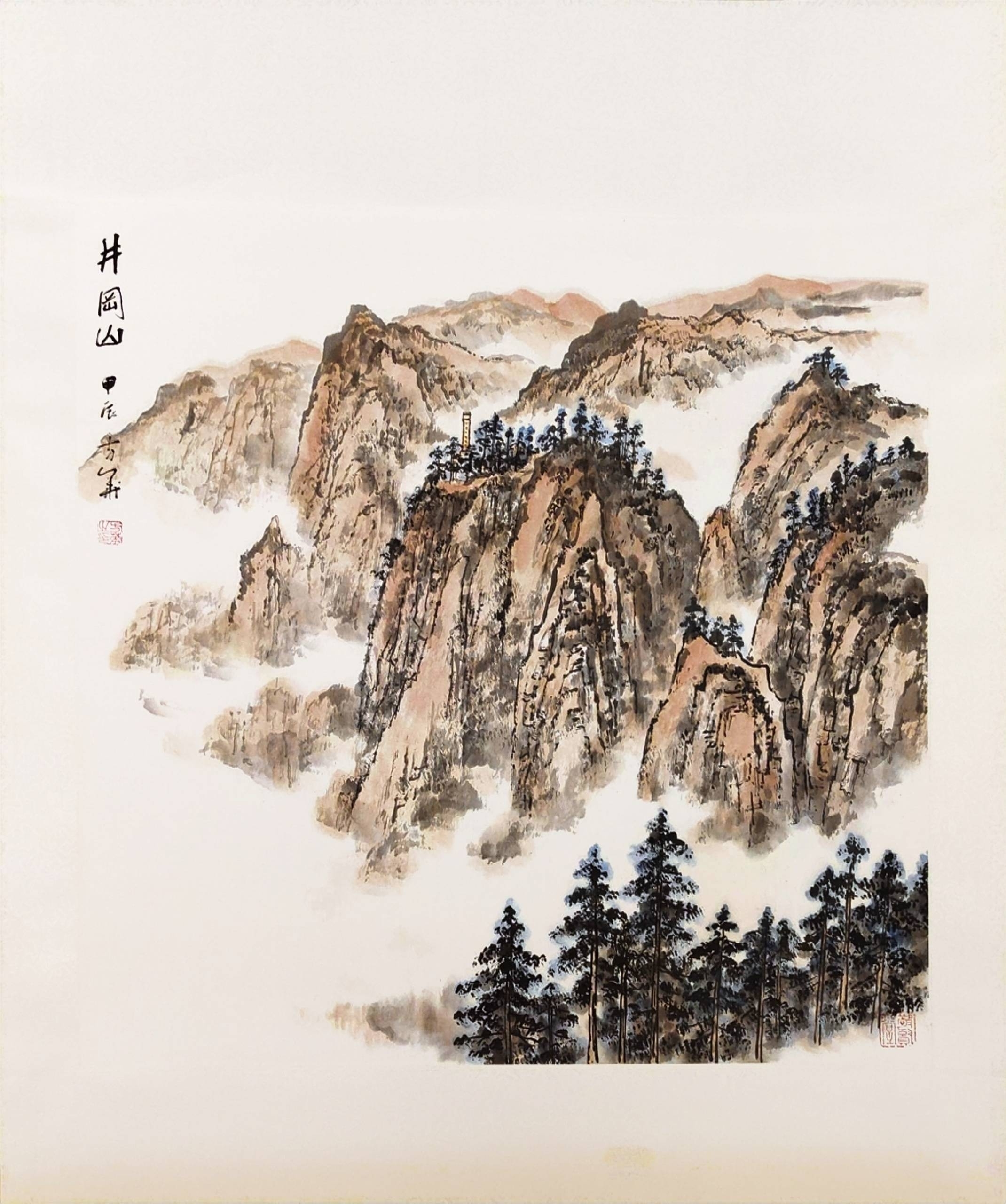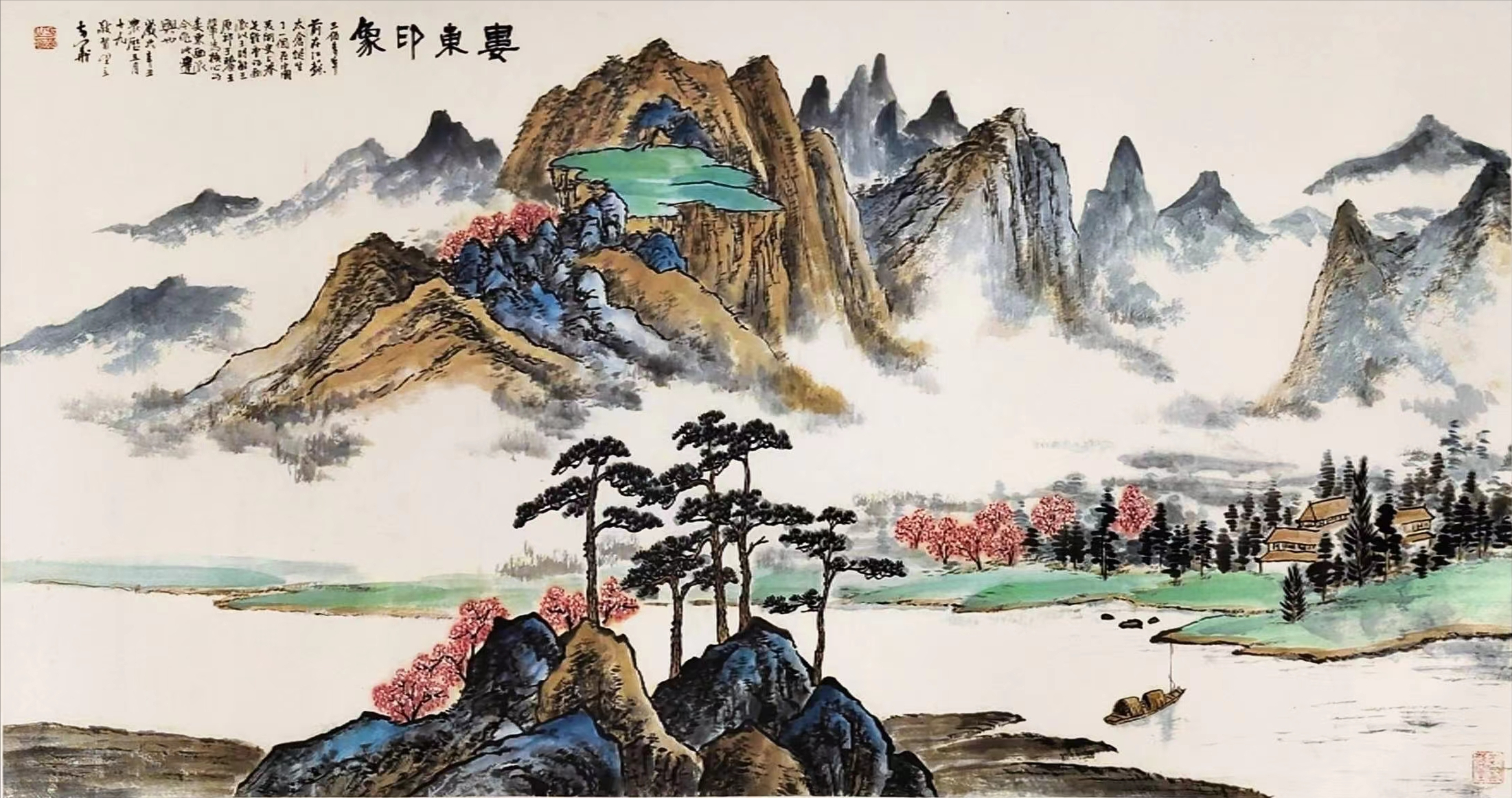 花果山作为连云港的标志性符号,承载着《西游记》的神话传说,也寄托着当地人的文化情感。在《花果山揽胜》中,方华没有刻意追求“写实”,而是以传统山水画的“写意”笔法,勾勒出花果山的层峦叠嶂与苍松翠柏。他笔下的山石,以斧劈皴、披麻皴结合的技法,既展现出山石的坚硬质感,又蕴含着水墨的晕染之美;山间的云雾,以淡墨轻染,若隐若现,为画面增添了“仙气”,恰如其分地呼应了花果山的神话意蕴。而《连云港印象》则更具“生活气息”,作品中不仅有连云港的山海风光,还融入了渔港、村落等元素,方华以细腻的笔触描绘出渔民劳作的场景、村落的宁静氛围,让观众在感受山水之美的同时,也能体会到连云港的人文温度。