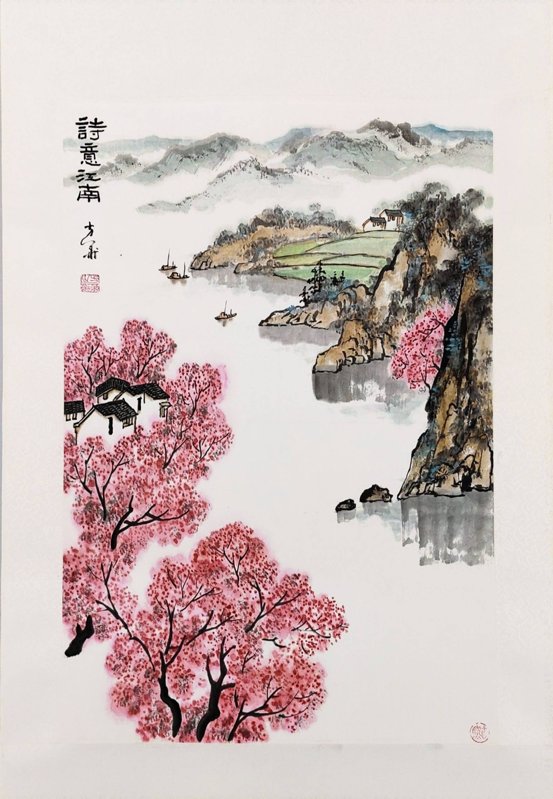 方华的创作,始终遵循“以笔墨为骨,以文化为魂”的原则。他的笔墨技法源于传统,却不被传统束缚——在继承林散之、亚明等大师笔墨精髓的基础上,他融入了自己对地域风光的理解,让笔墨既有“古意”,又有“新意”。例如,在表现连云港的海水时,他突破了传统山水画“以淡墨代水”的手法,而是以浓淡不一的墨色、流畅的线条,勾勒出海水的波澜壮阔,既保留了水墨的韵味,又展现出大海的雄浑气势。这种“承古开新”的笔墨语言,让他的作品既能被传统书画爱好者认可,也能吸引年轻观众的目光。