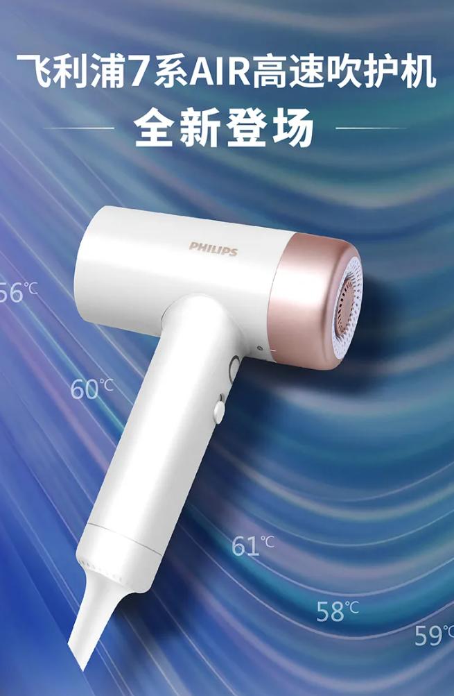 飞利浦内置高精度智能芯片,实时监测风温并随头发干湿动态调节,干发效率上,其搭载12.5万转/分高速无刷电机,中长发5分钟左右即可吹干。