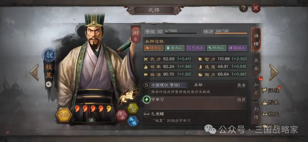 前几天程昱迎来了一波小加强,程昱自带主技能的十面埋伏技能描述前后颠倒了一下,这样的更新,用玩家的话来说,看似加强,胜似没