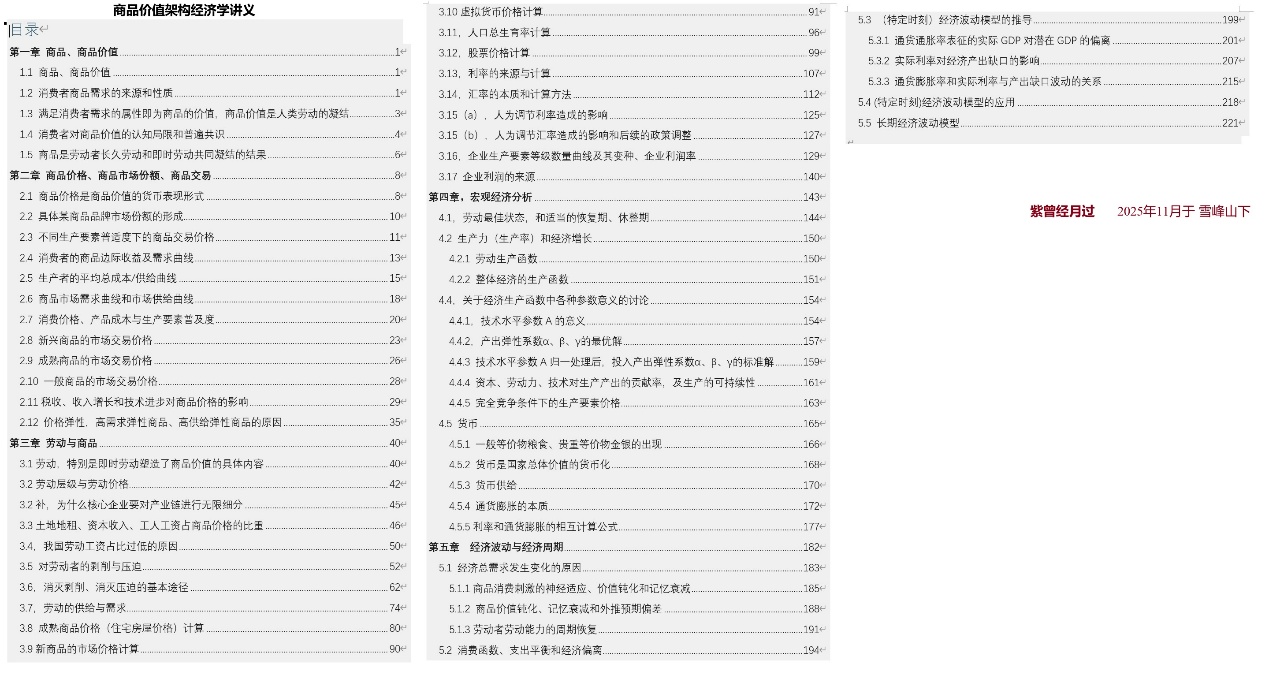 在书写中国经济长期、可持续、高速增长的思考、建议、措施的过程中,阿紫我系统性的梳理了我的个人自创理论,一个完整的、系统的、自洽的商品价值架构理论已经呼之欲出了。25年6月,阿紫我回到了雪峰山下的童年故地,开始理论的整理和书写,三月之后,终于完成了一本叫做《商品价值架构经济学讲义》的东西。当然,这份类似教材的理论讲义还有很多瑕疵、还有很多需要修正、需要调整、需要整合的地方;但无论怎样,阿紫我自创的商品价值架构理论已经诉诸文字,可以向这个世界进行具体呈现了。