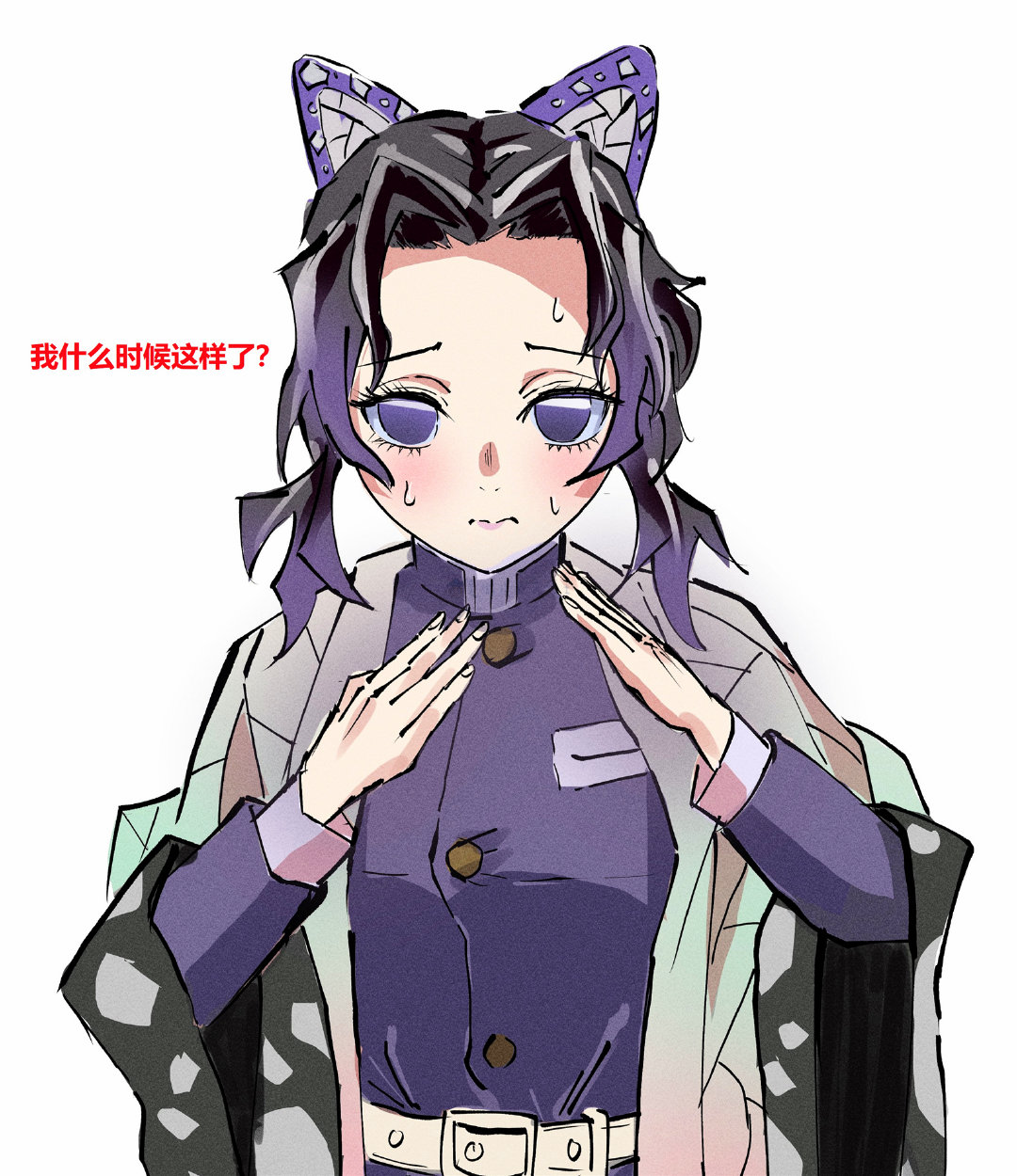 而近期,一个所谓的“蝴蝶忍姿势”在相关社群里还挺火的!日本不少年轻人在拍摄大头贴或者日常自拍的时候,都会摆出一个双手手指伸直、并且举至胸前的姿势。在博士的印象中,不少女性在“战斗”前会摆出这个架势,而奇怪的是:大家分享的时候都会提到这是“蝴蝶忍姿势”。蝴蝶忍是《鬼灭之刃》中的虫柱,确实会经常战斗,她在剧中摆过这种姿势吗?