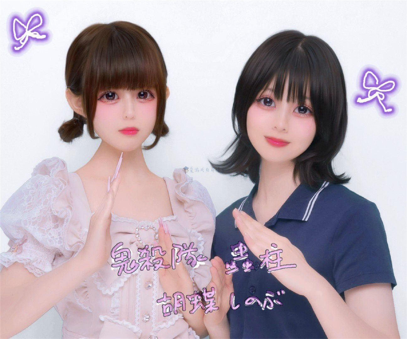 博士真的不记得,马上又去查阅了一下,发现社群里绝大多数《鬼灭之刃》粉丝也都很不解,因为蝴蝶忍在动漫里没这么弄过啊!所以这个“蝴蝶忍姿势”是怎么凭空冒出来的呢?更奇怪的是它还在日本年轻人之间大流行,让人百思不得其解。我真不是胡说八道的,最近许多日本年轻人(尤其是女性)都会摆出“蝴蝶忍姿势(胡蝶しのぶポーズ)”,虽然P图P得有些过分,但是她们确实自认为在模仿虫柱的动作。