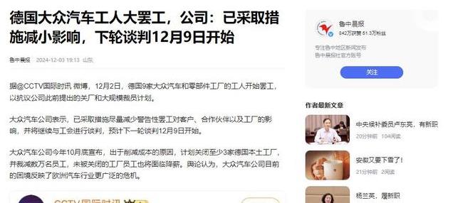 鲁中晨报 ——德国大众汽车工人大罢工,公司:已采取措施减小影响,下轮谈判12月9日开始