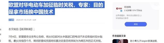 文章信源:欧盟对华电动车加征临时关税,专家:目的是拿市场换中国技术——环球网
