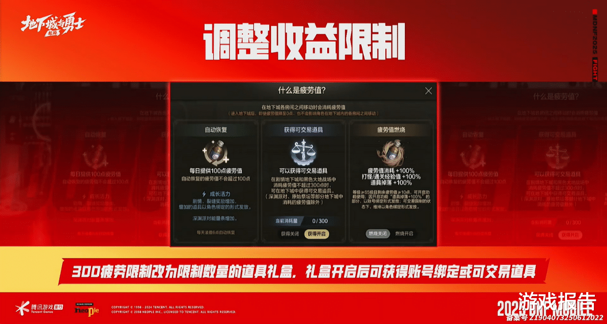 在新版本当中,300疲劳值收益限制终于要移除了,转而通过控制重要道具的获取数量控制经济平衡,其他更多的改动还在讨论中。