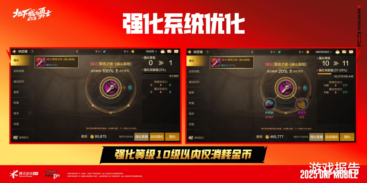 强化的门槛也被进一步降低,强化0-9级仅消耗金币,这也意味着小号可以轻松强化到全身10级。增幅和强化的改动都能帮助小号和萌新玩家更快地追赶进度,小号终于不再只是砖厂黑奴了。