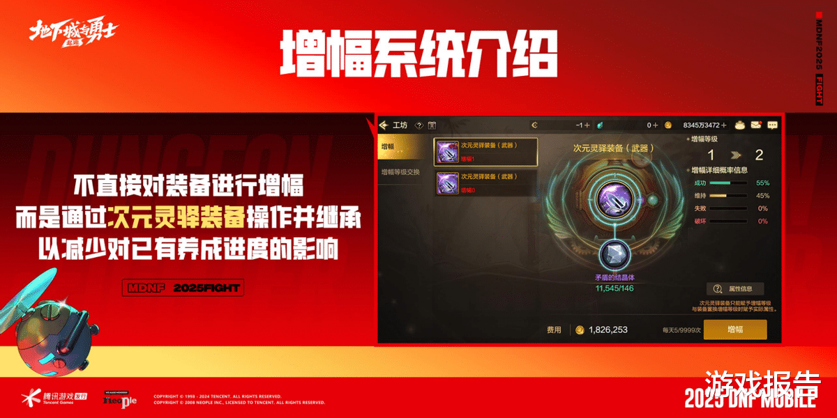 DNF手游特别引入了“增幅球”系统:简单来说,就是对增幅球进行增幅,而非对装备。增幅失败仅影响增幅数值,这样一来即便增幅失败角色也不会变弱。增幅的材料“矛盾的结晶体”在本次满级扩张地区游玩时就可以自然获得,所有勇士都能体验到增幅的乐趣。