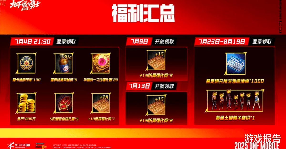本次直播前瞻还有游戏内福利,现在登录就能领取印章*100、疲劳药*5、强化器(强化20以下)*20、金币*800万、+18强化券;7月9日可领3张防具+15强化券,7月13日还有2张防具15级强化券;7月23日满级扩张更新当天登录,有1000张新深渊票和黄金头套时装。各位勇士也记得按时上线,不要错过福利哦!