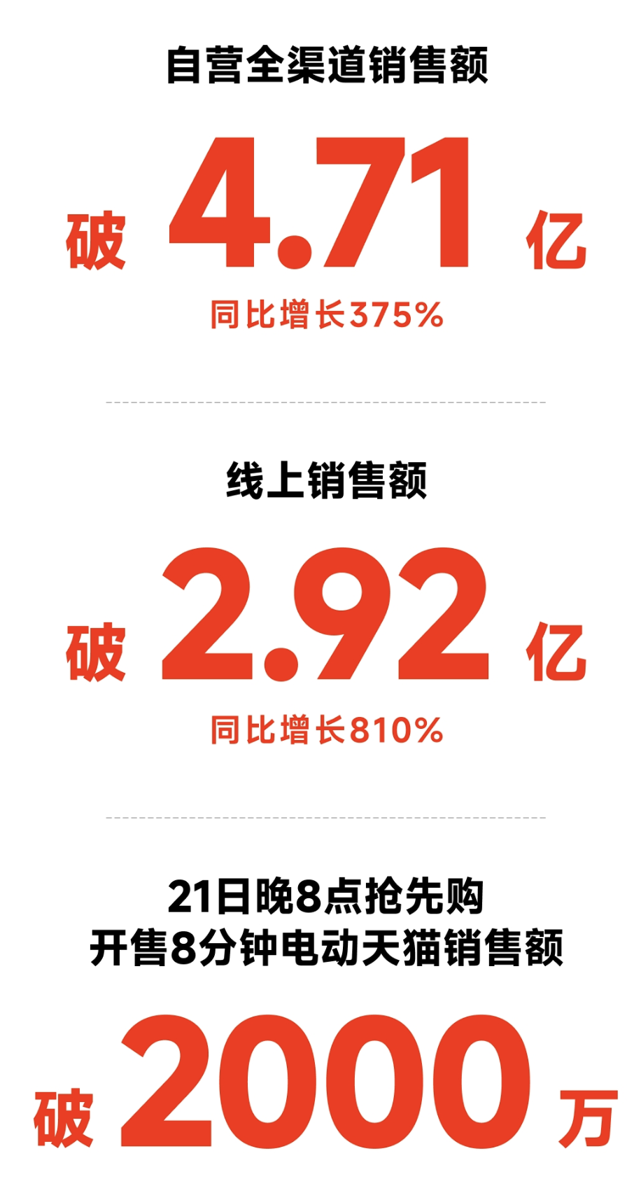 举个例子,从10月14日晚8点起至10月21日24点,九号公司实现自营全渠道销售额超4.71亿元,同比增长375%,其中线上销售额超2.92亿元,同比增长810%,公司智能电动两轮车、电动滑板车、电动平衡车等产品持续领跑各细分品类,为本轮11奠定了良好开局。