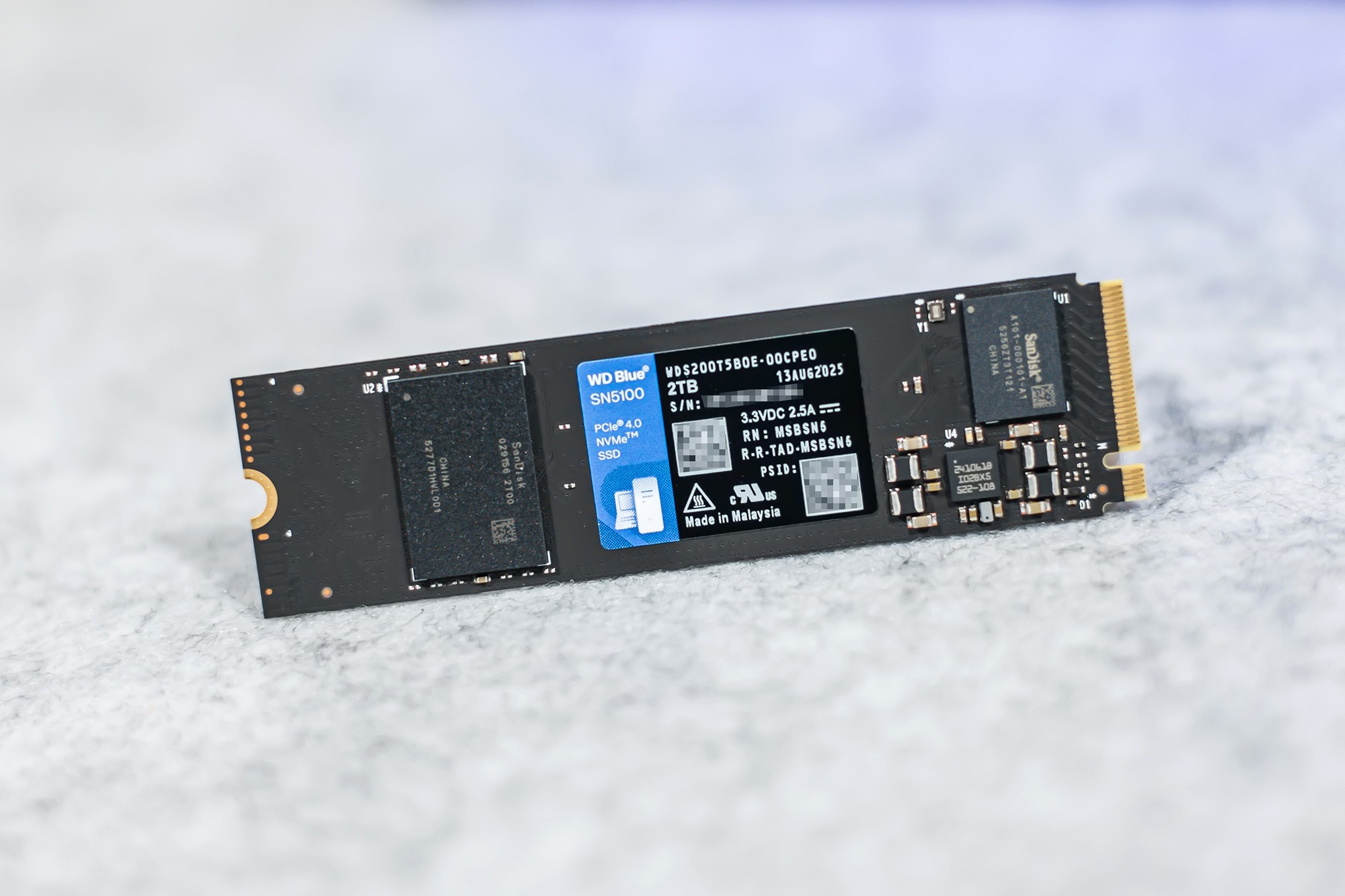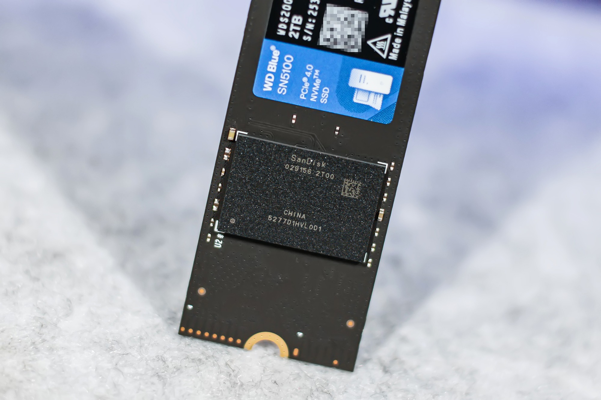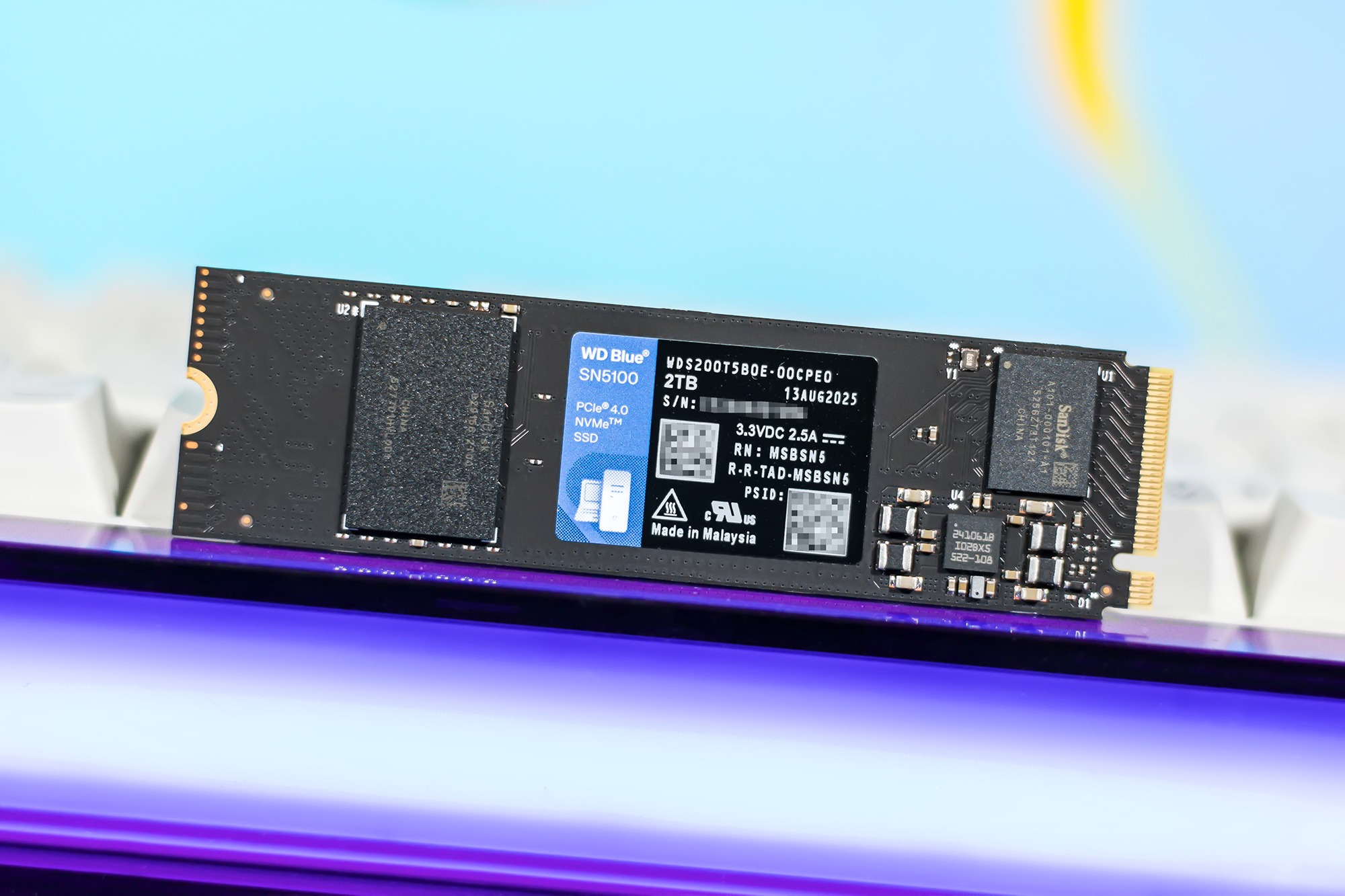 闪迪WD Blue SN5100固态硬盘搭载SANDISK BICS 8 QLC 3D CBA NAND闪存颗粒,其丝印编码为029156 2T00,单颗粒容量达到2TB,支持nCache 4.0技术,固态硬盘提供500GB、1TB、2TB与4TB四种容量规格,目前在售容量版本为500GB、1TB与2TB,在预算允许的前提下尽量选择大容量版本。