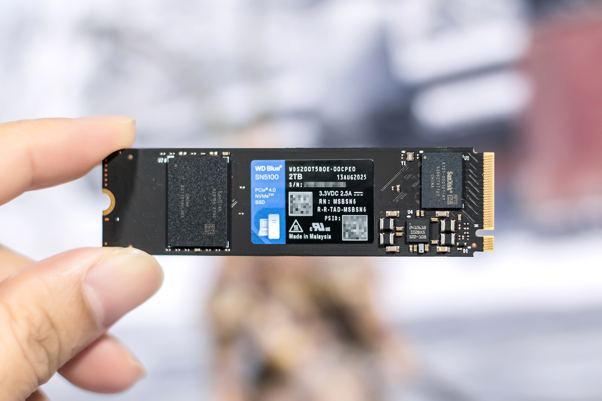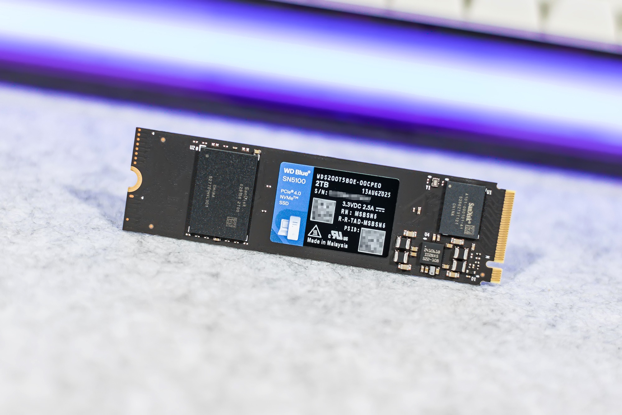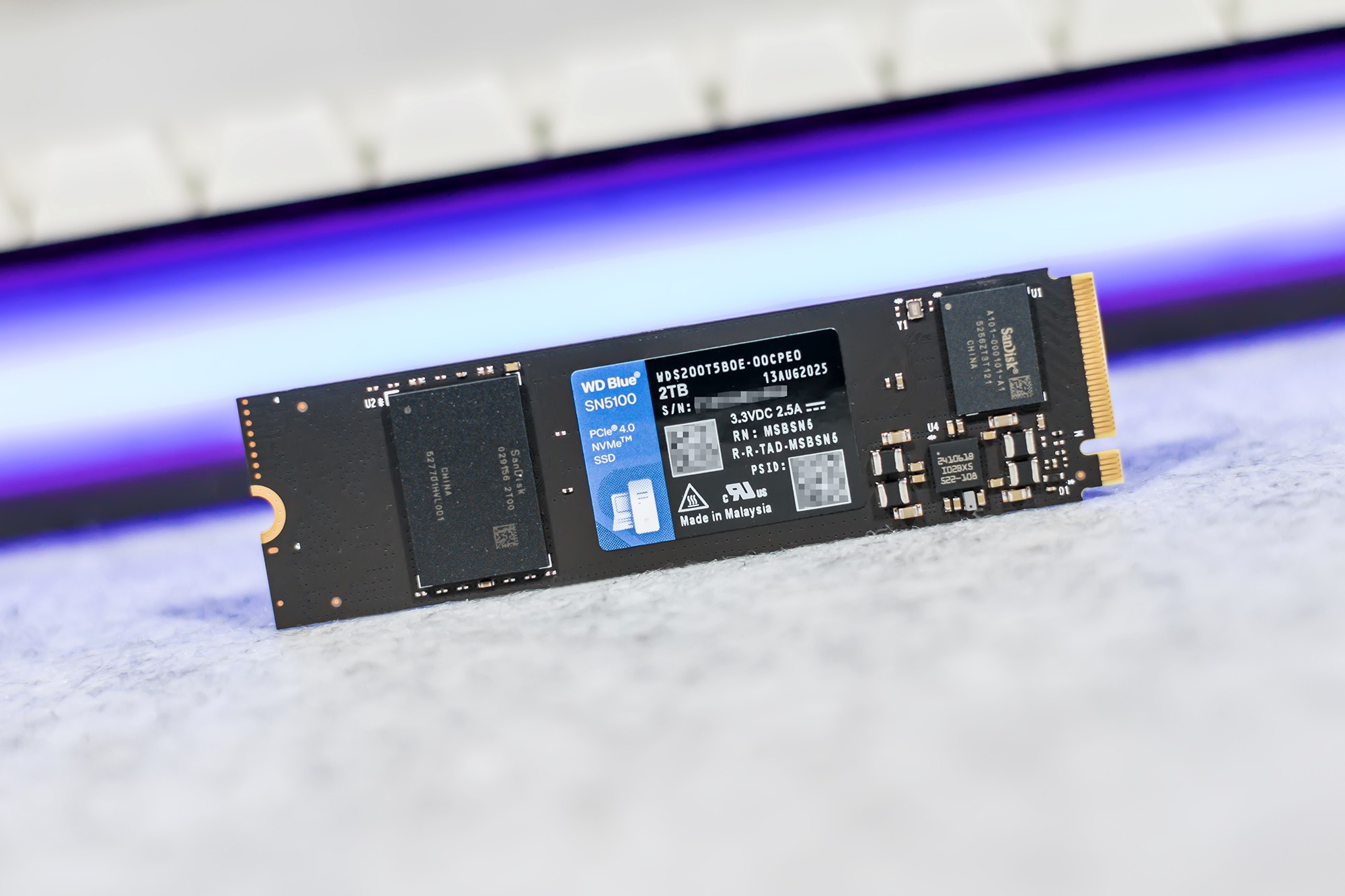 闪迪WD Blue SN5100固态硬盘搭载SANDISK BICS 8 QLC 3D CBA NAND闪存颗粒,其丝印编码为029156 2T00,单颗粒容量达到2TB,支持nCache 4.0技术,固态硬盘提供500GB、1TB、2TB与4TB四种容量规格,目前在售容量版本为500GB、1TB与2TB,在预算允许的前提下尽量选择大容量版本。