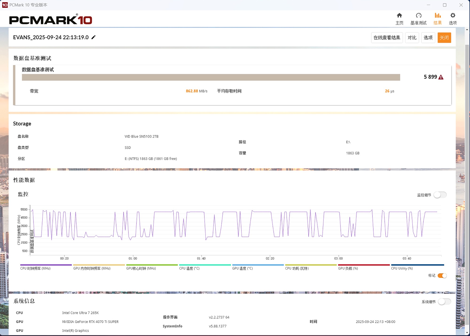 PCMark10基准性能测试软件,数据盘基准测试项目,闪迪WD Blue SN5100固态硬盘的成绩为5899分,单宽为862.88MB/s,平均存取时间为26μs,属于很不错的成绩。