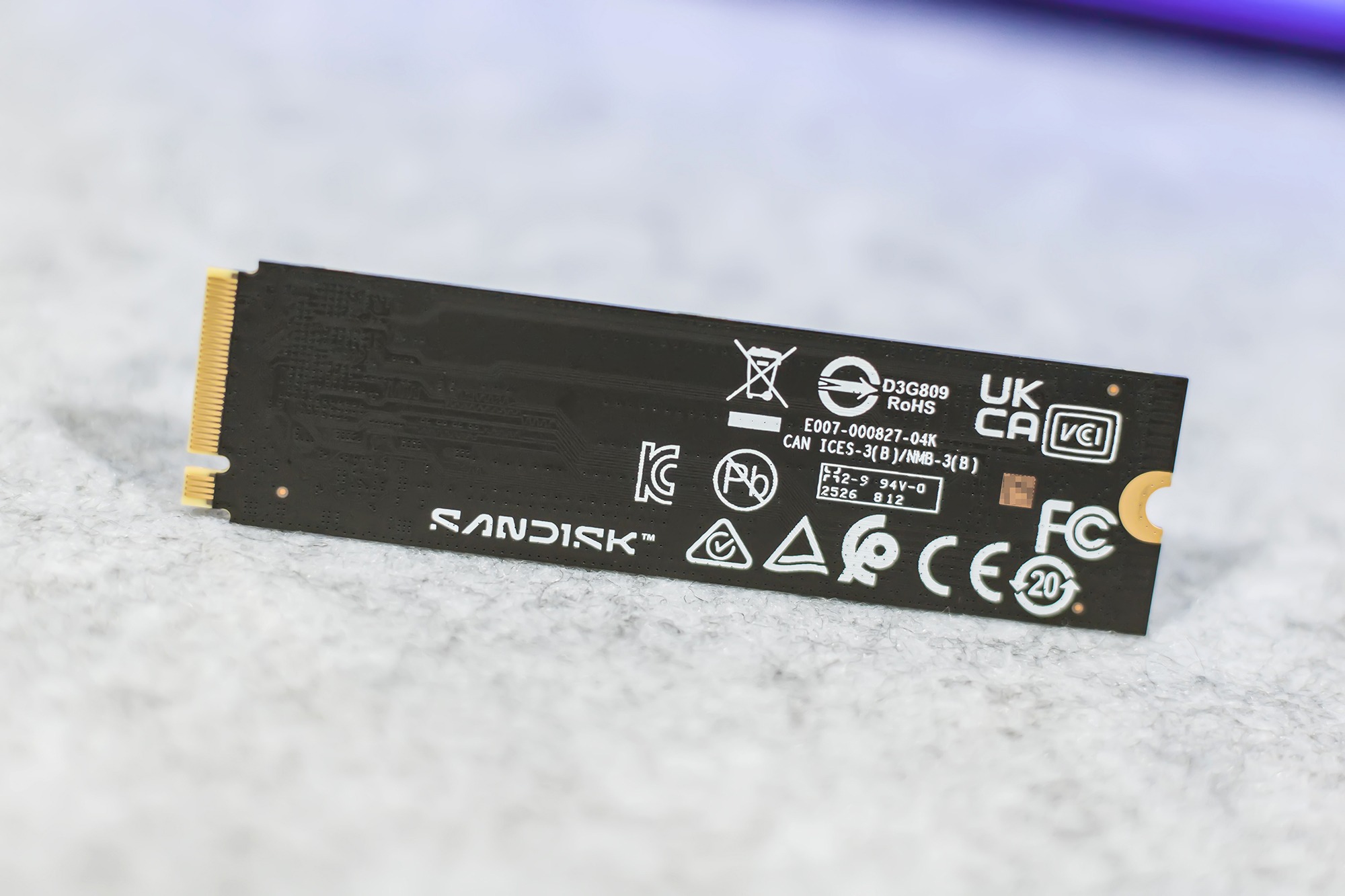 主控芯片与闪存颗粒相距较远,可有效避免发热源过于集中,固态硬盘的背面并没有配备任何元器件,表面仅印有认证标识,2TB容量版本的标称顺序读取写入速度可达7100MB/s与6700MB/s,最大4K随机读取写入为1000K IOPS与1300K IOPS,具体性能表现下面会详细测试。