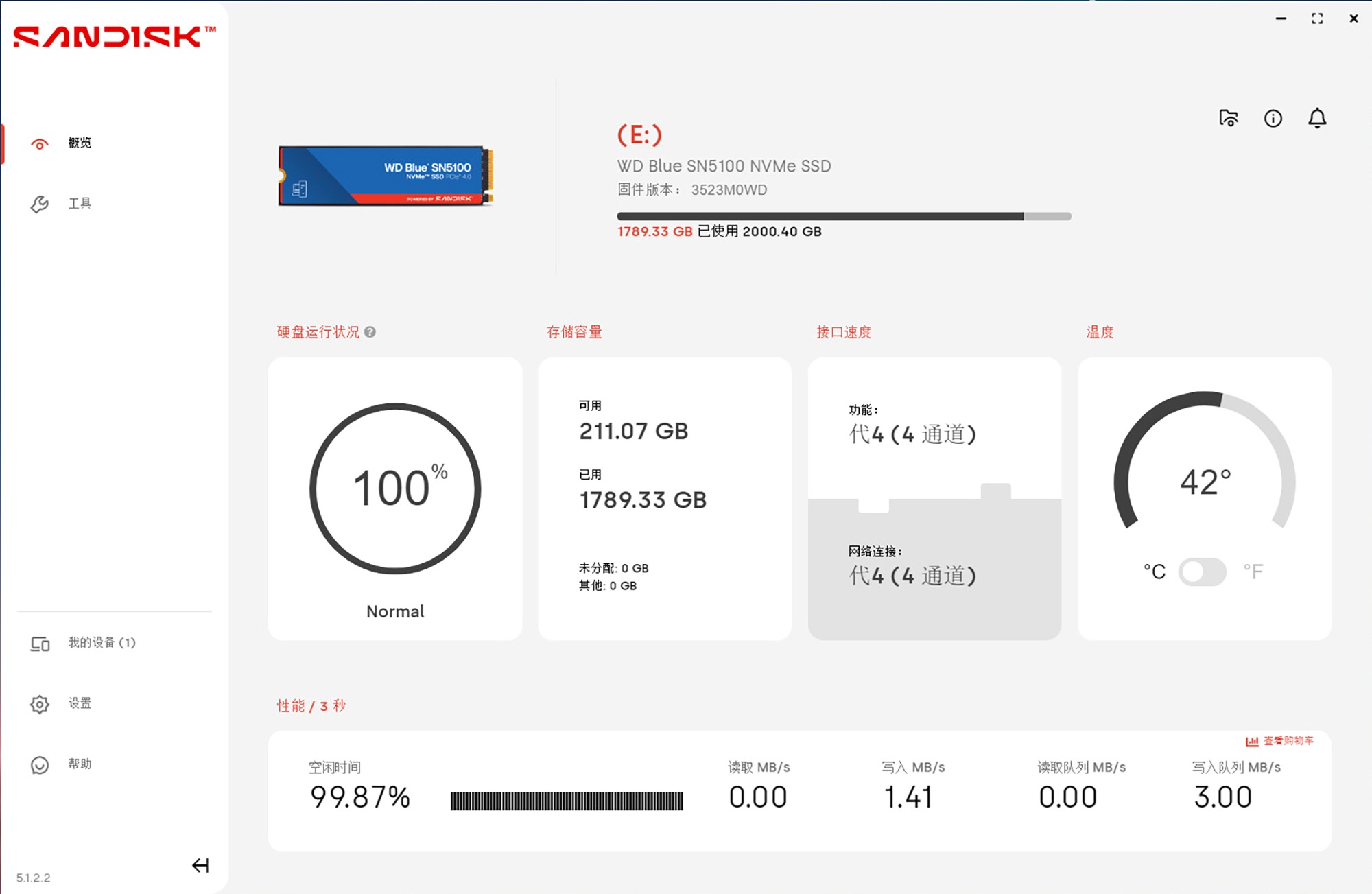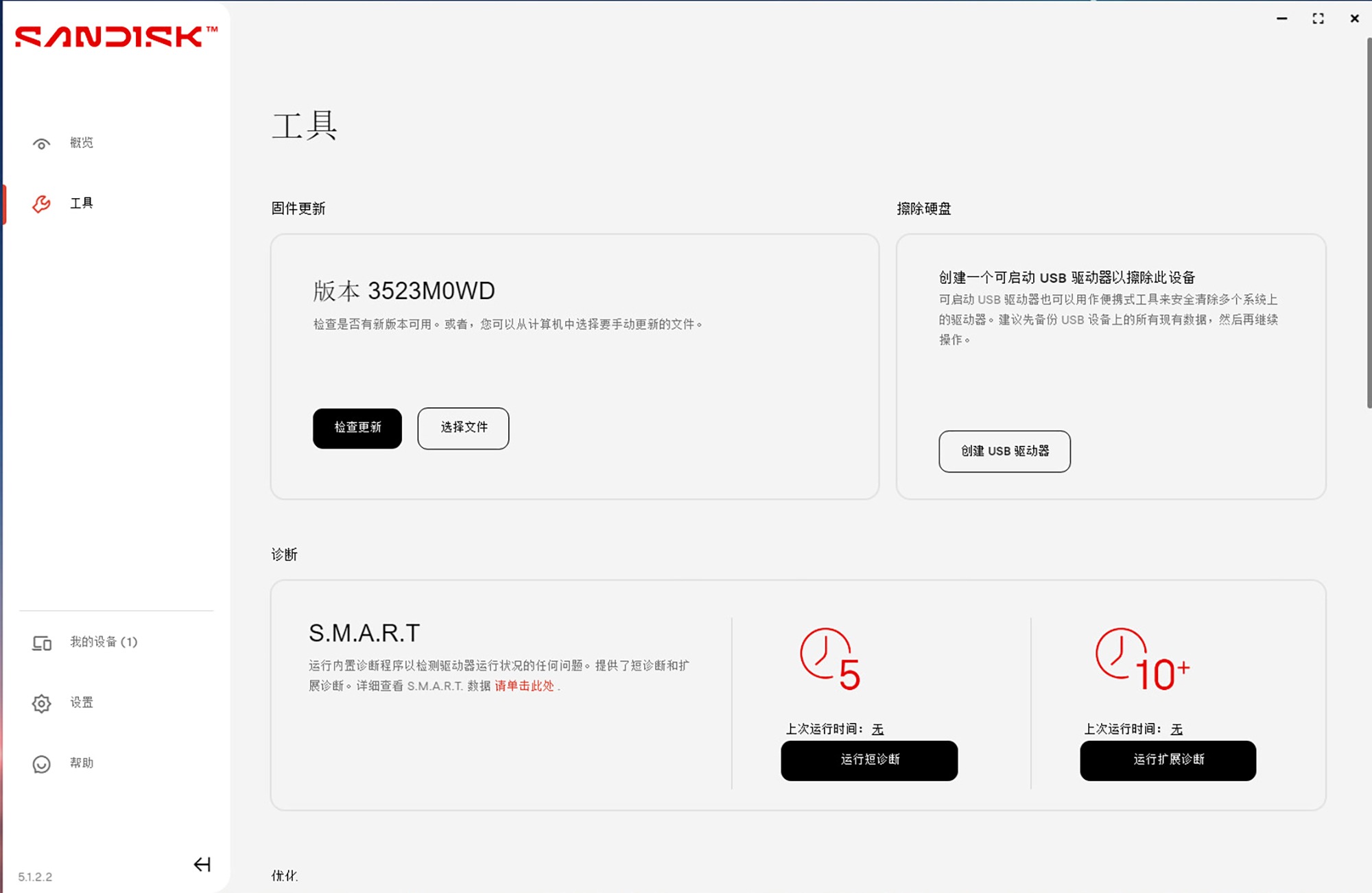用户也可通过专属的Sandisk Dashboard仪表盘工具快速了解固态硬盘运行状态,包括当前温度容量与读写速度等关键信息,此外还可通过软件对固态硬盘进行固件升级优化性能,或者安全擦除固态硬盘数据,使固态硬盘恢复到出厂状态确保数据安全,设置写缓存功能或者开关Windows的TRIM功能。