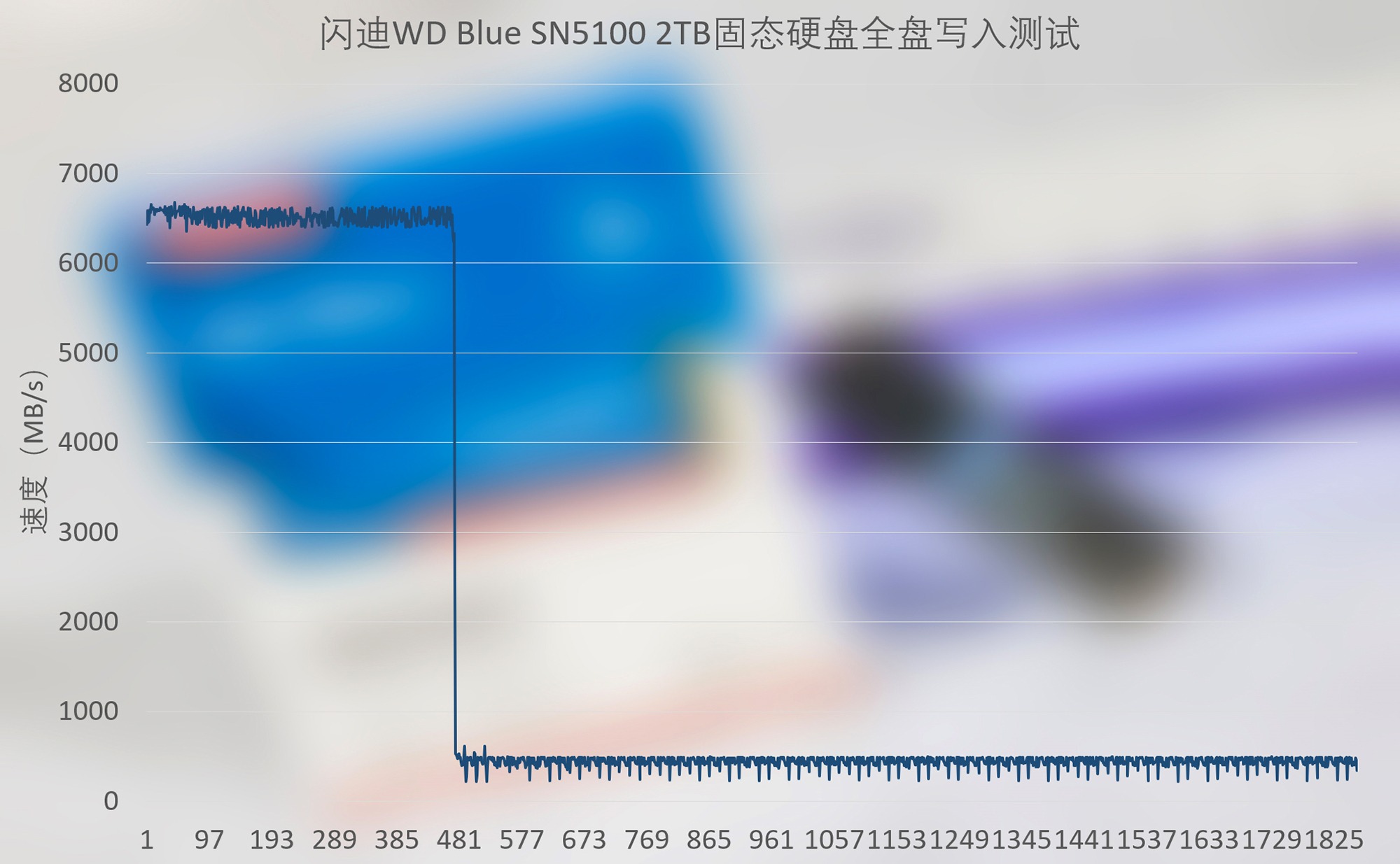 顺道对闪迪WD Blue SN5100 2TB固态硬盘进行全盘写入测试,从曲线可见呈现出两段式写入速度,在空盘状态下,SLC缓存大小约为470GB,此时写入速度能达到6500MB/s,当SLC缓存耗尽后进入直写模式,此时写入速度也能达到450MB/s,全盘写入总耗时约为55分钟。