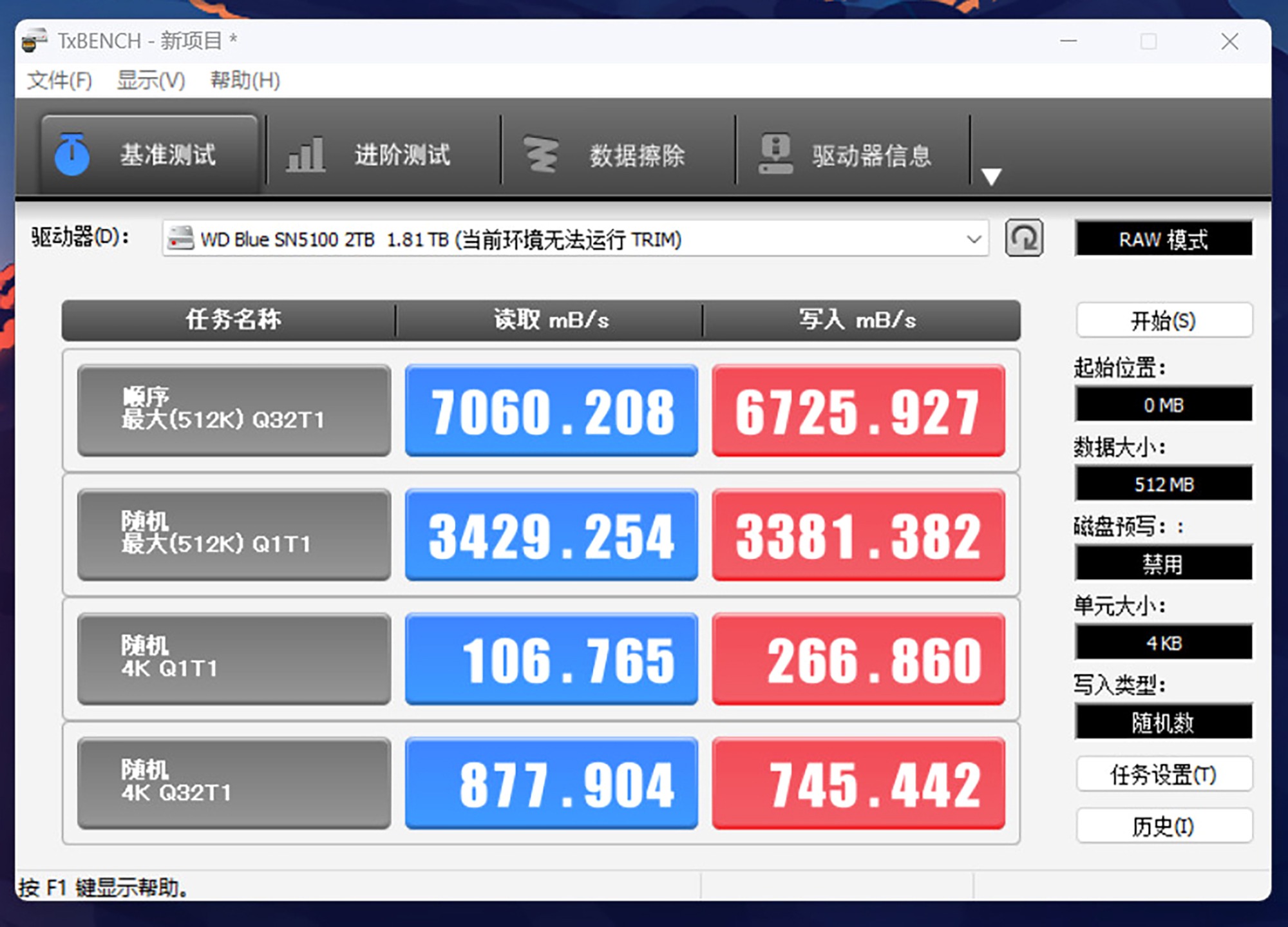 TxBENCH基准性能测试软件,测试结果一般会低于前面的Crystal Disk Mark软件,实测闪迪WD Blue SN5100固态硬盘的顺序读写速度分别为7060MB/s和6725MB/s,在4K单线程随机读写速度分别为106.765MB/s与266.860MB/s。