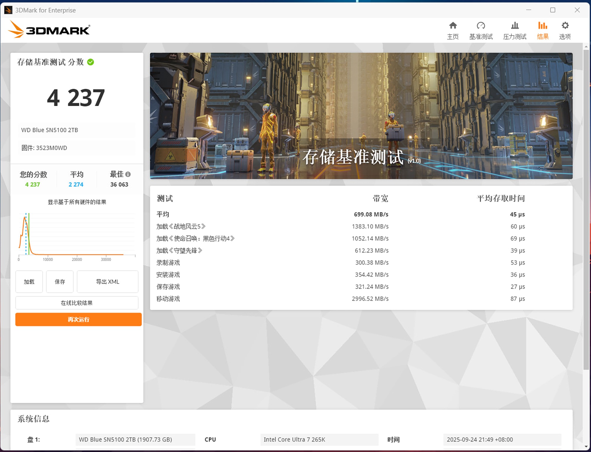 3DMark基准性能测试软件存储基准测试项目,成绩高低会受到硬件平台或接口的影响,闪迪WD Blue SN5100固态硬盘在该测试项目中的得分为4237,平均带宽为700MB/s,平均存取时间只有45μs,加载《战地风云5》游戏时带宽为1383MB/s。