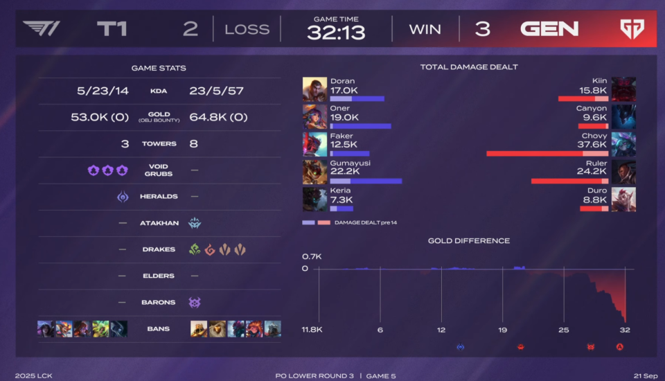 在上一场T1完成了对自我的一次救赎,淘汰DK后锁定了LCK最后一个世界赛名额,但是种子顺位还得要自己拼!他们在败者组下一轮对阵的是GEN,此前GEN的状态一直都很不稳定,但这一场打下来,感觉GEN他们又醒了!双方又一次打满五局,打到决胜局,但最后还是GEN得阵容更有优势!从最后一把的BP就能够看出来,T1选出了一个POKE加拉扯带线的阵容,可是明显队伍这套体系熟练度不高,反观GEN选出了一个开团阵容,猛猛冲无脑开团,并且打得非常成功!最终在GEN一次次进攻,并且拿到了土龙魂的情况下,成功拿下胜利,只能说T1这一局的表现太水了!