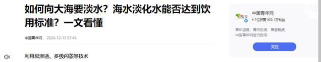 中国青年网2024-12-13——如何向大海要淡水?海水淡化水能否达到饮用标准?一文看懂