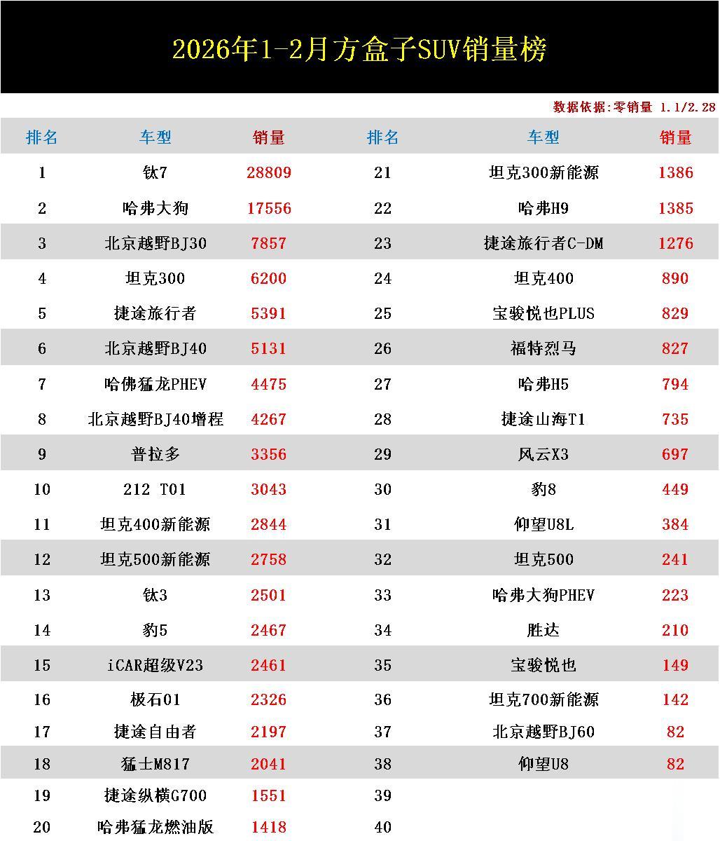 导读:在庞大的汽车市场中,方盒子车型凭借独特的外观以及强劲的机械性能,已然成为了众多特定消费者购车的首选之一。根据乘联会近期公布的2026年1-2月方盒子SUV零售量排行榜数据显示,在上榜的40款车型里面超过了半数以上的车型累计销量突破了千辆大关,再次证明了这一细分市场热度持续高涨的程度。其中方程豹钛7以及哈弗大狗这两款车型更是以万辆以上的销量成绩占据榜单前两名,而北京越野BJ30表现也都不俗,排名荣升至季军,坦克300和捷途旅行者均稳居榜单前五,北京越野BJ40、普拉多、212T01都名列榜单前十名。值得一提的是,随着多家车企不断增加新车型涌入市场,如今的方盒子SUV正在呈现百花齐放的竞争局面,内部排名也在持续洗牌中。全面开花!1-2月方盒子SUV销量榜:哈弗大狗丢冠,普拉多进入前十