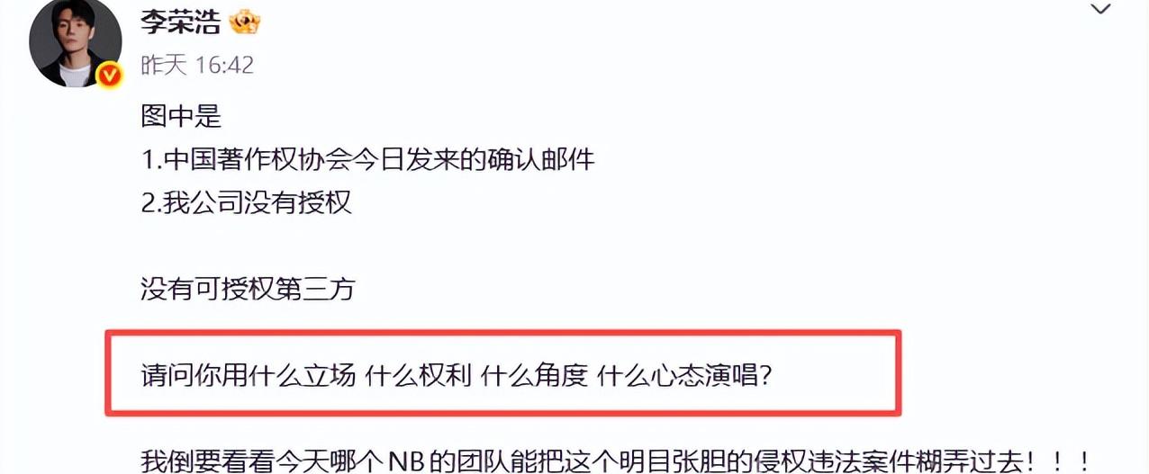 先是李荣浩和单依纯,版权这个事,真就不能糊弄,李荣浩亲自下场发文,点名要道歉,因为单依纯在演唱会上唱了李白,据说没拿到授权,之前还被婉拒过,然后还唱,这不就尴尬吗