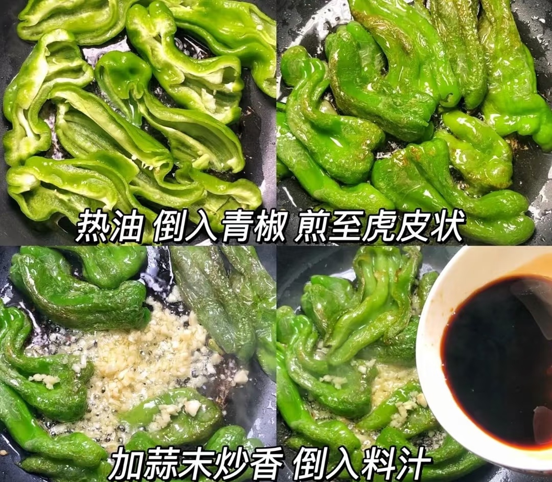 - 煎至青椒表面出现焦斑,形成类似“虎皮”的花纹,此时青椒也会变得稍微软塌。