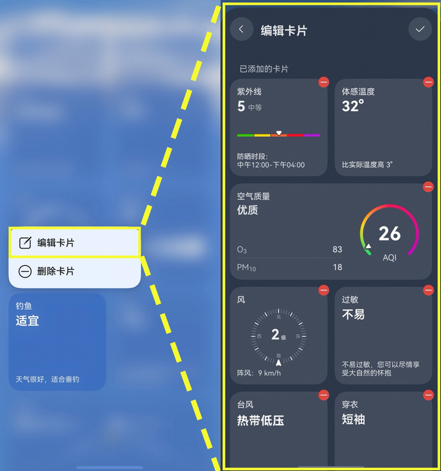 我迫不及待地按照骑友分享的方法,先升级系统,进去天气界面,长按天气卡片,直接进入编辑模式,想调整顺序就拖一拖,想删掉无关卡片就移一移,操作简单得不像话!