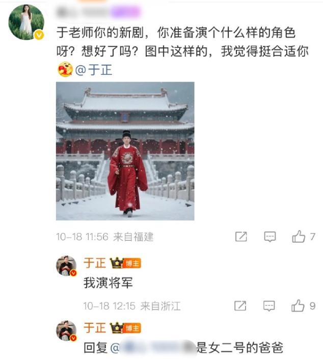 看到于正卖力宣传《金吾不禁》,很多网友都对这部剧产生兴趣,但让所有人没想到的是,于正竟要出演这部剧,有网友问于正:在新剧中,你准备出演一个什么角色?于正回答:我演将军,也就是女二号的爸爸。
