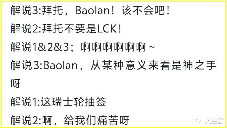 没想到1-1组的抽签,宝蓝还在继续发力,LCK的GEN和T1,迎来赛区内战,BLG则是遇到了,实力稍弱一些的G2,HLE的签运也不错,抽到了100T,最后是FLY迎战越南TSW,看到抽签结果的那一刻,LCK的官方解说们,在比赛直播现场直接破防哀嚎:啊啊啊,Baolan给我们痛苦啊。
