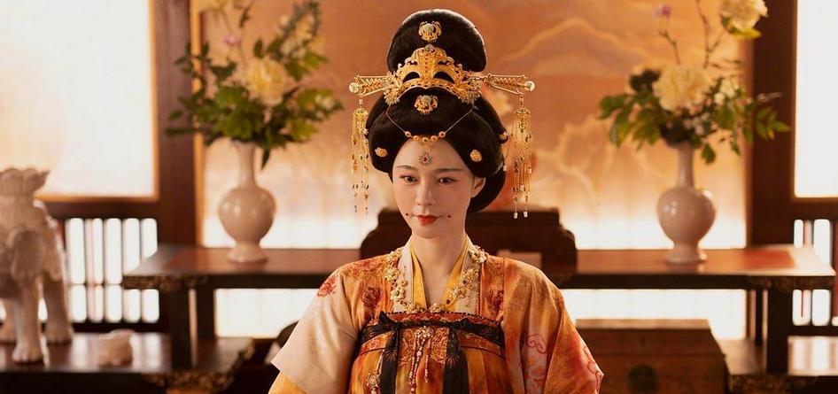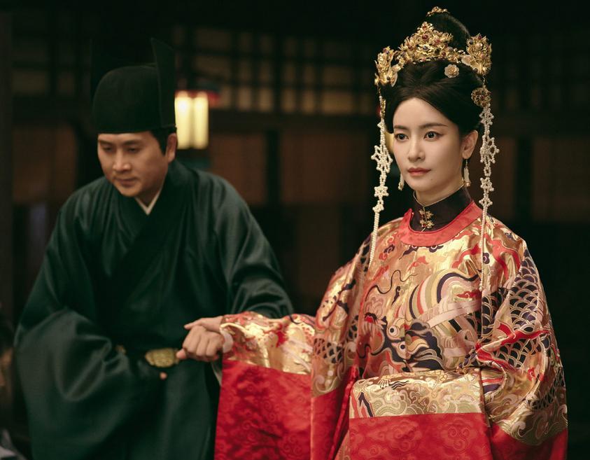 头戴金钗,身着缀金红衣,在一众随从的簇拥下,尽显雍容华贵。